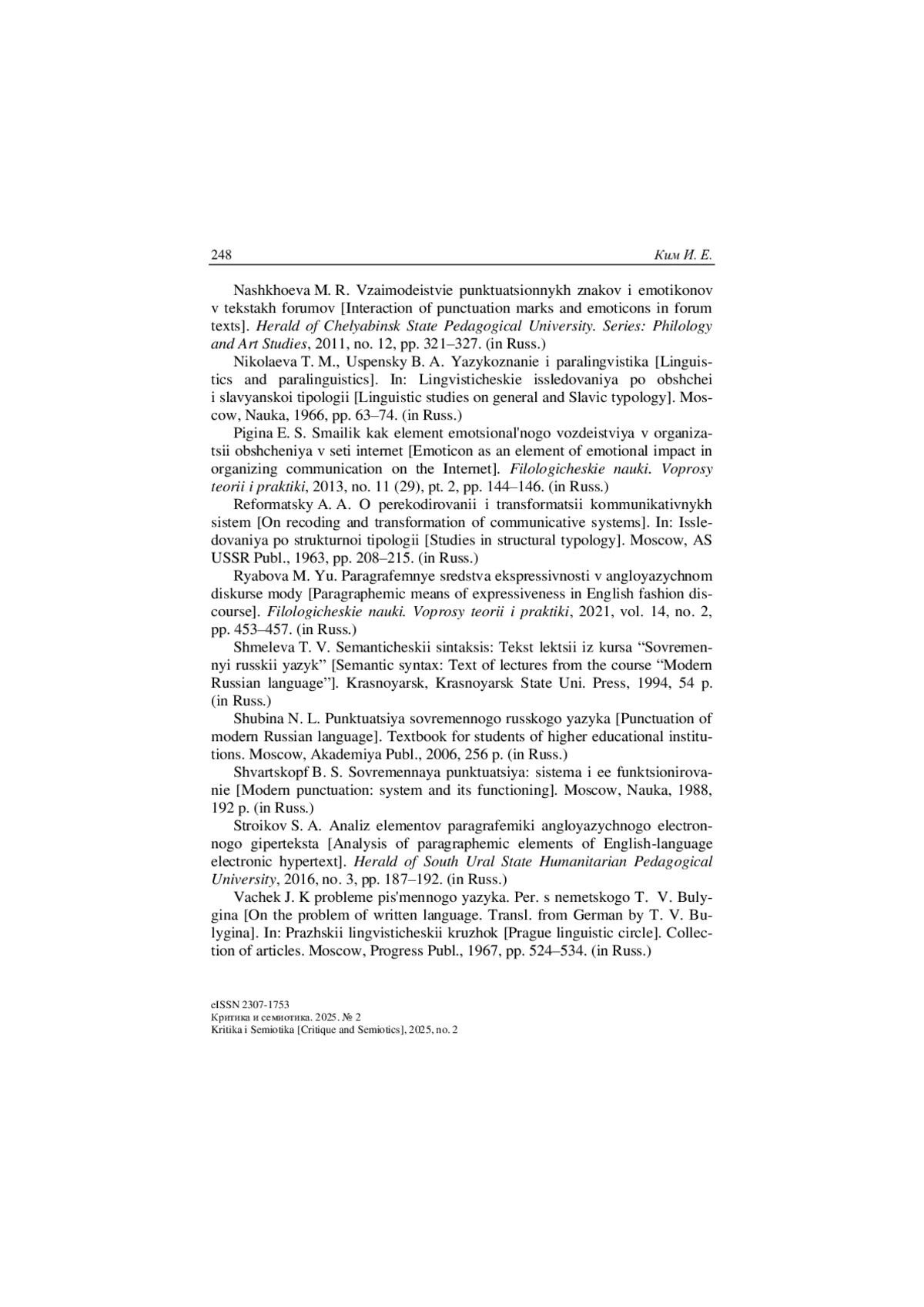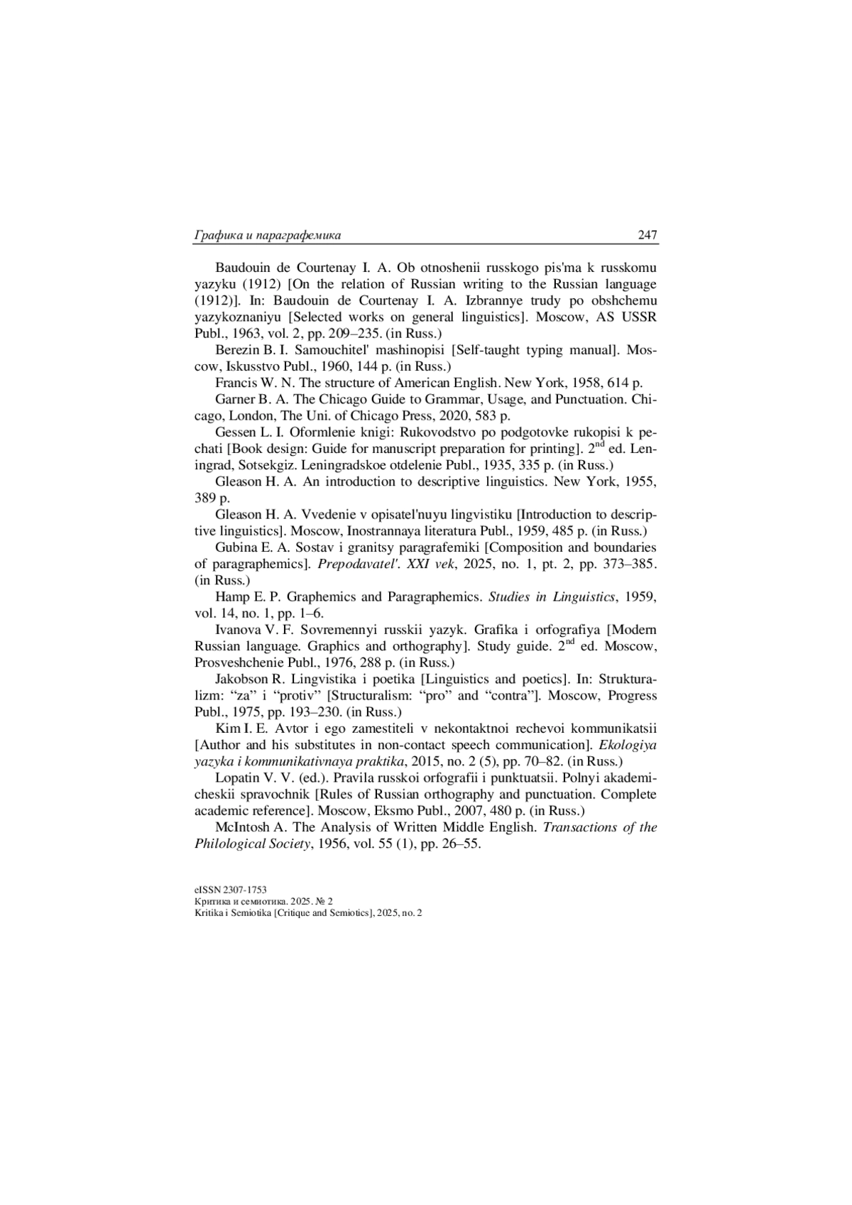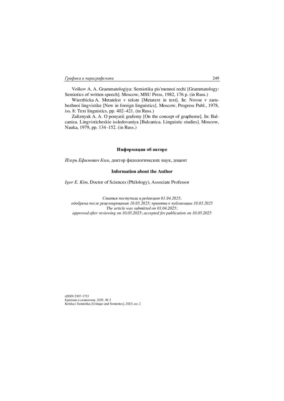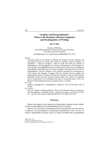 КИМ И. Е. ГРАФИКА И ПАРАГРАФЕМИКА: ГДЕ ПРОХОДИТ ГРАНИЦА МЕЖДУ ЛИНГВИСТИКОЙ И ПАРАЛИНГВИСТИКОЙ ПИСЬМА // КРИТИКА И СЕМИОТИКА. 2025. № 2