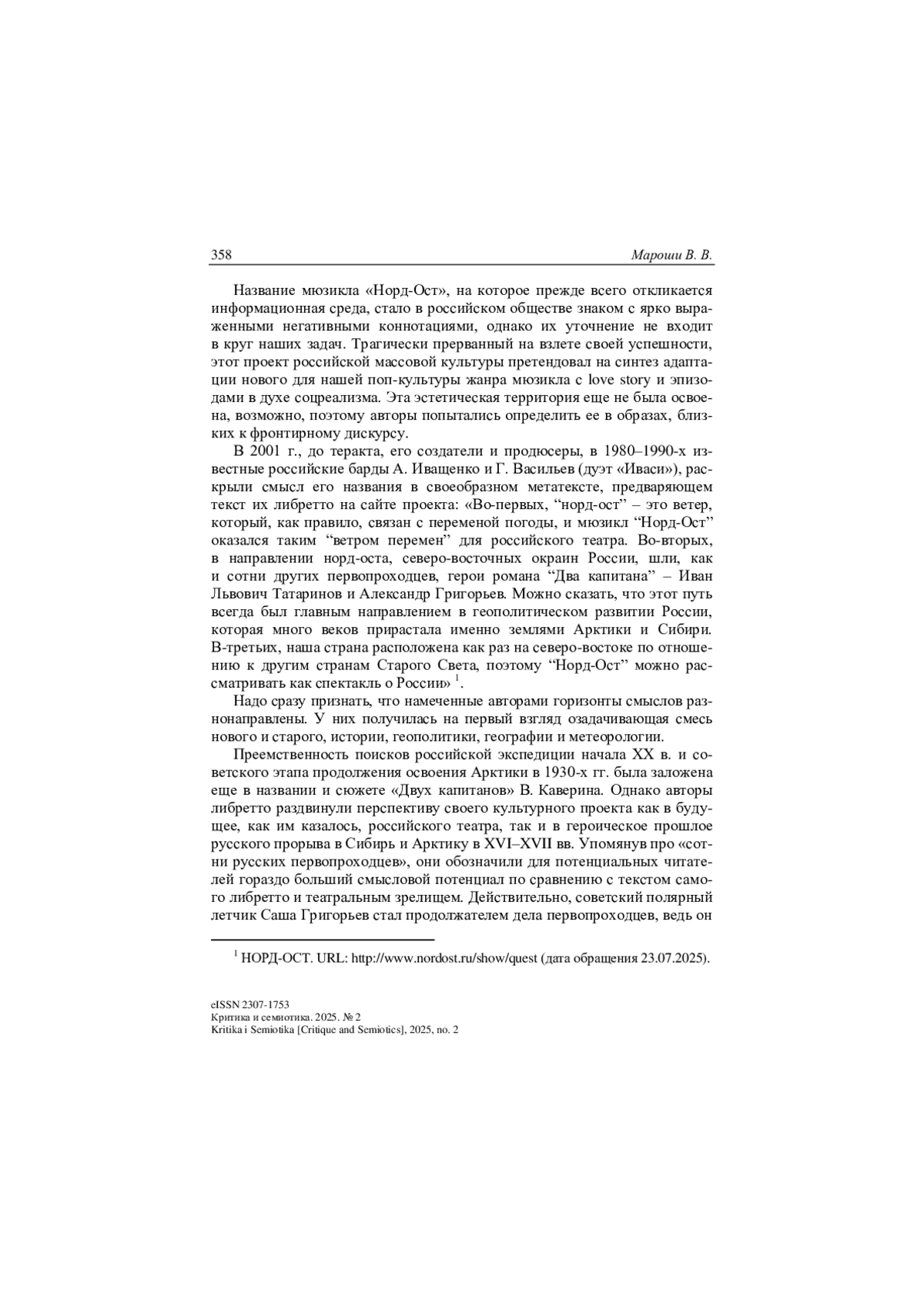 Название мюзикла «Норд-Ост», на которое прежде всего откликается информационная среда, стало в российском обществе знаком с ярко выра-женными негативными коннотациями, однако их уточнение не входит в круг наших задач. Трагически прерванный на взлете своей успешности, этот проект российской массовой культуры претендовал на синтез адаптации нового для нашей поп-культуры жанра мюзикла с love story и эпизодами в духе соцреализма. Эта эстетическая территория еще не была освоена, возможно, поэтому авторы попытались определить ее в образах, близких к фронтирному дискурсу.