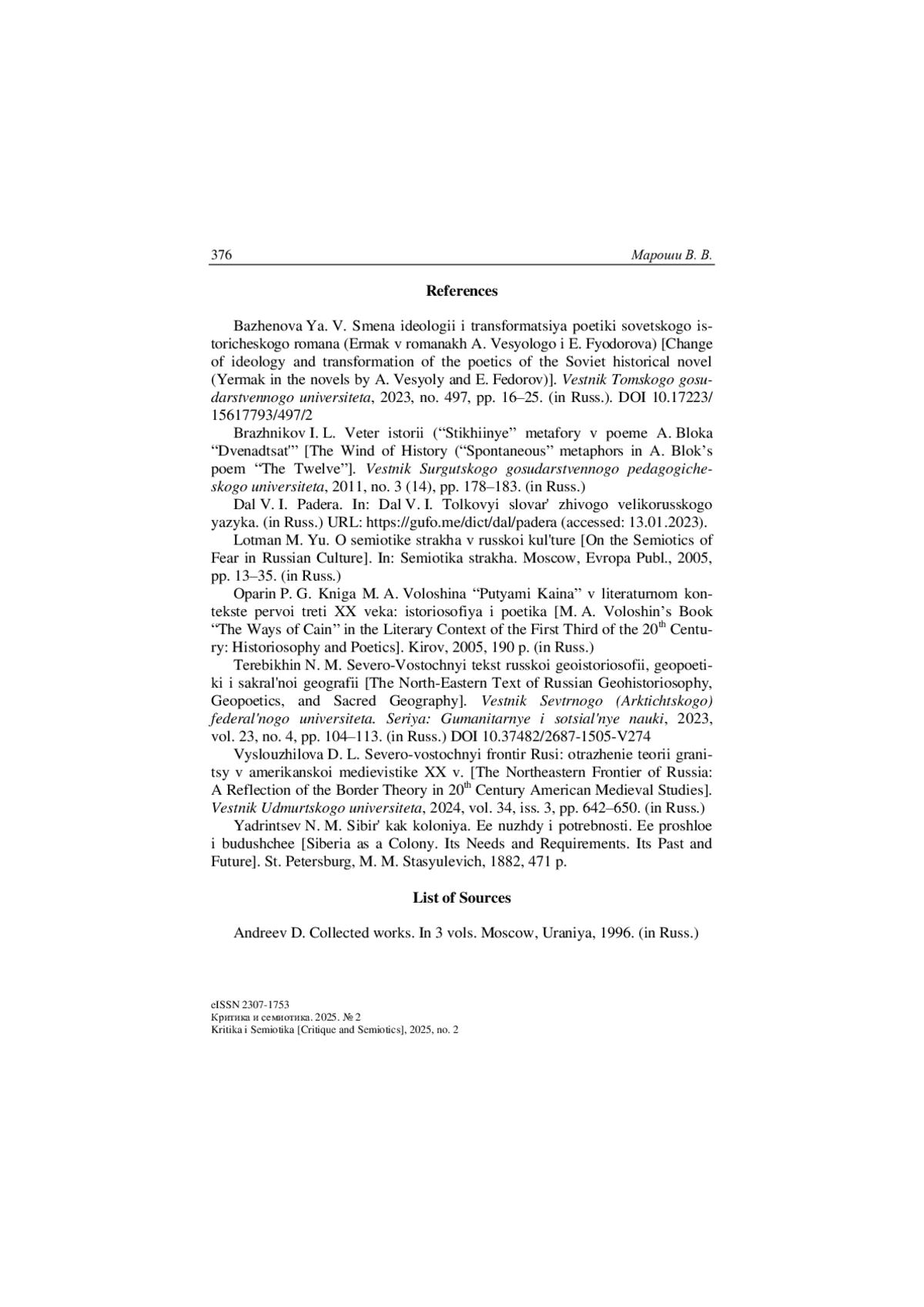 1. Баженова Я. В. Смена идеологии и трансформация поэтики советского исторического романа (Ермак в романах А. Веселого и Е. Федорова) // Вестник Том. гос. ун-та. 2023. № 497. С. 16-25. DOI: 10.17223/15617793/497/2