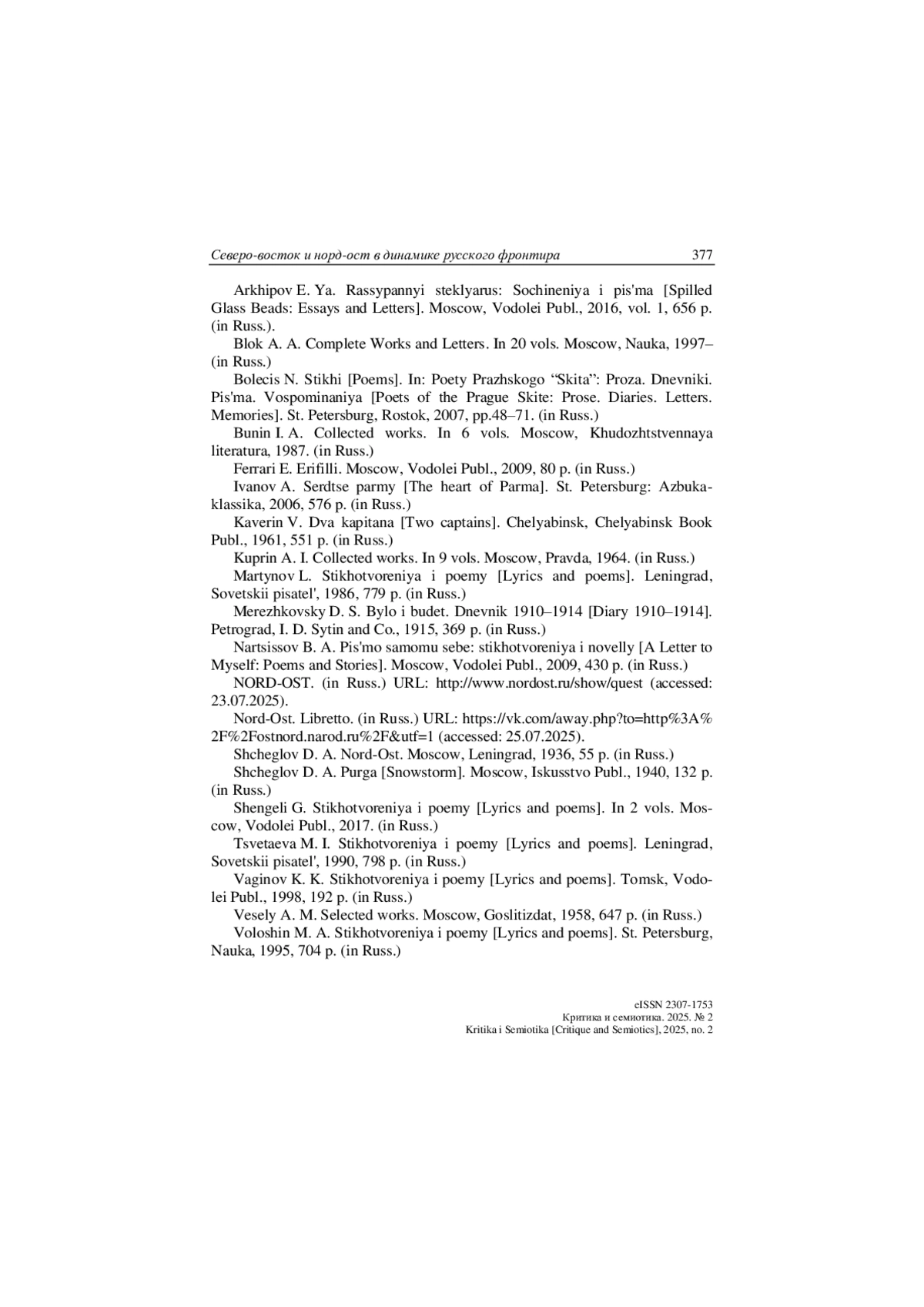 7. Теребихин Н. М. Северо-Восточный текст русской геоисториософии, геопоэтики и сакральной географии // Вестник Сев. (Арктич.) федер. ун-та. Серия: Гуманитарные и социальные науки. 2023. T. 23, № 4. С. 104-113. DOI: 10.37482/2687-1505-V274 8. Ядринцев Н. М. Сибирь как колония. Ее нужды и потребности. Ее прошлое и будущее. СПб.: Тип. М. М. Стасюлевича, 1882. 471 с.