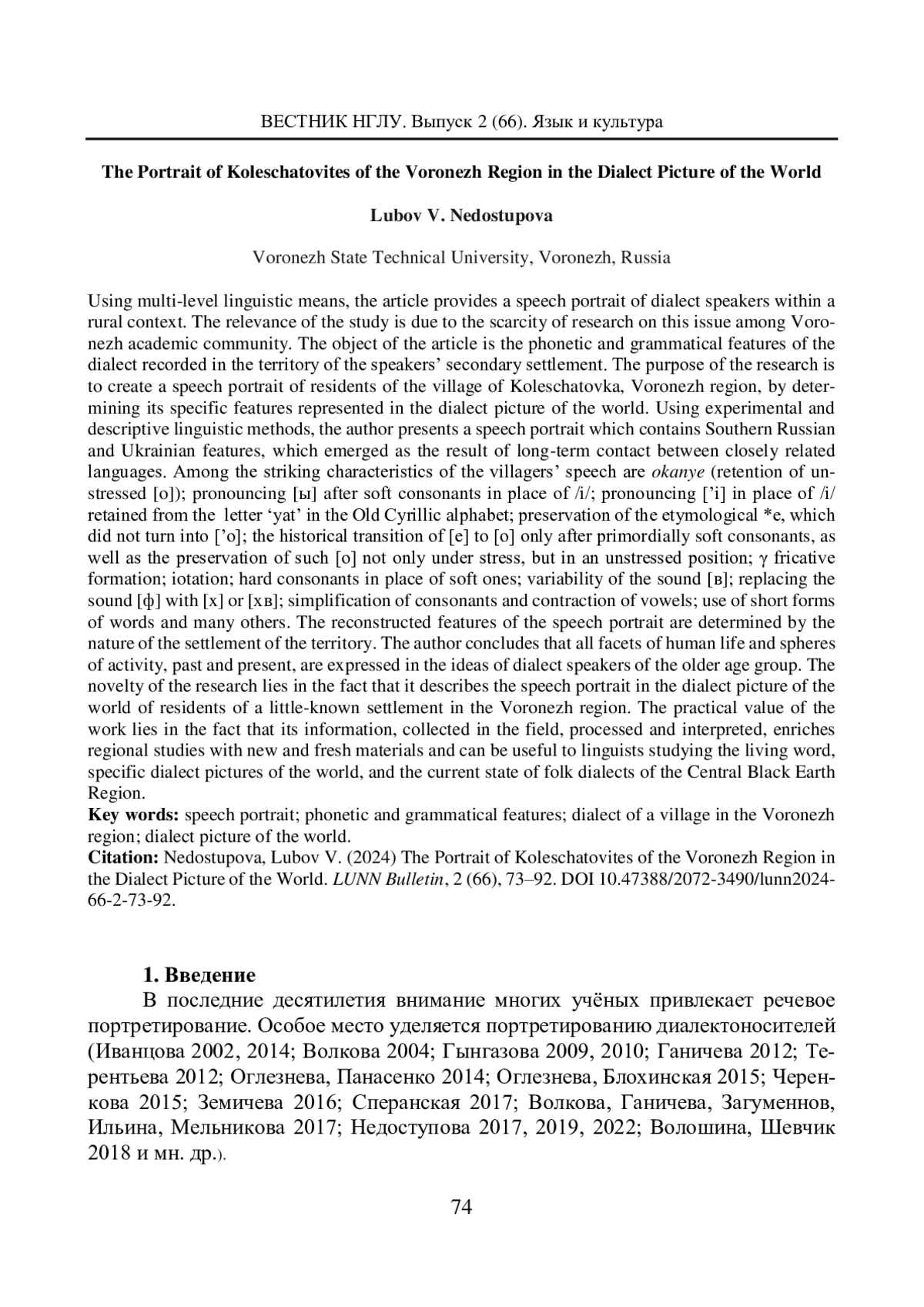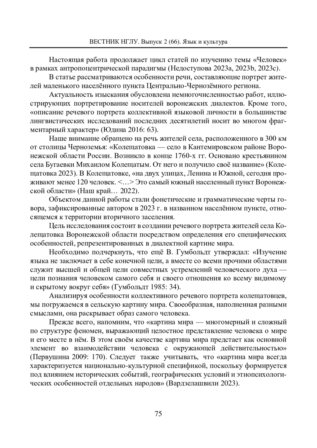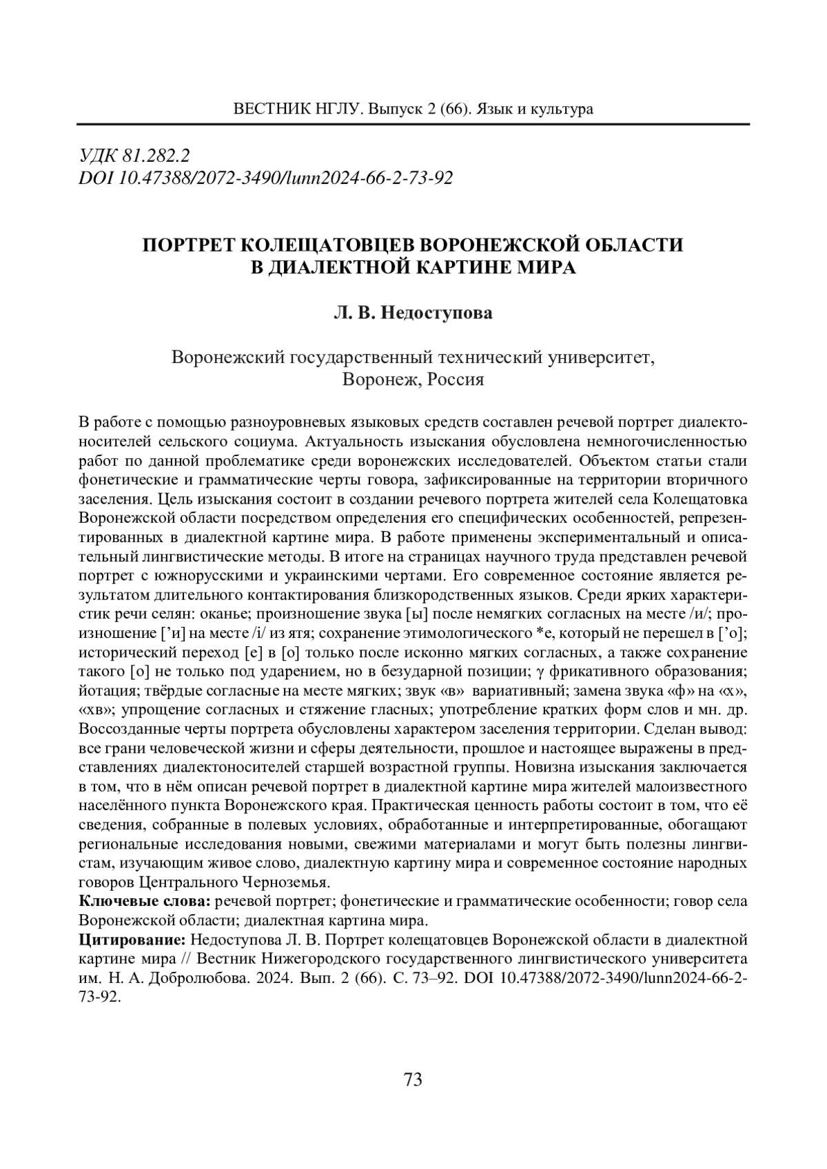 24. Недоступова Л. В. Диалектная языковая личность села Коломыцево Воронежской области // Филология и культура. Philology and Culture. 2023c. № 4 (74). С. 32-40. EDN: CTMOWX