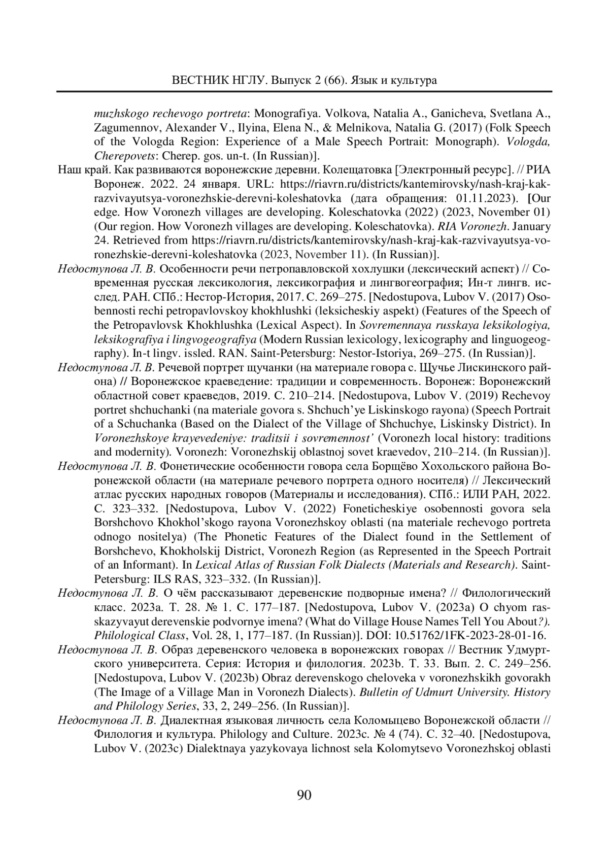 22. Недоступова Л. В. О чём рассказывают деревенские подворные имена? // Филологический класс. 2023a. Т. 28. № 1. С. 177-187. EDN: ROGMLX