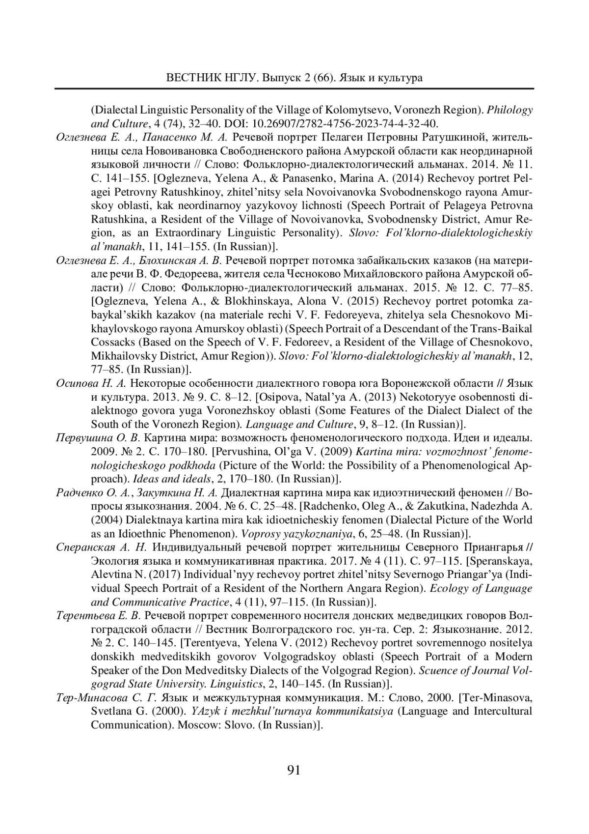 25. Оглезнева Е. А., Панасенко М. А. Речевой портрет Пелагеи Петровны Ратушкиной, жительницы села Новоивановка Свободненского района Амурской области как неординарной языковой личности // Слово: Фольклорно-диалектологический альманах. 2014. № 11. С. 141-155. EDN: TEDPXF