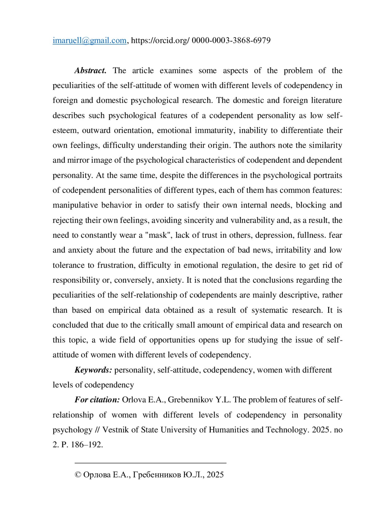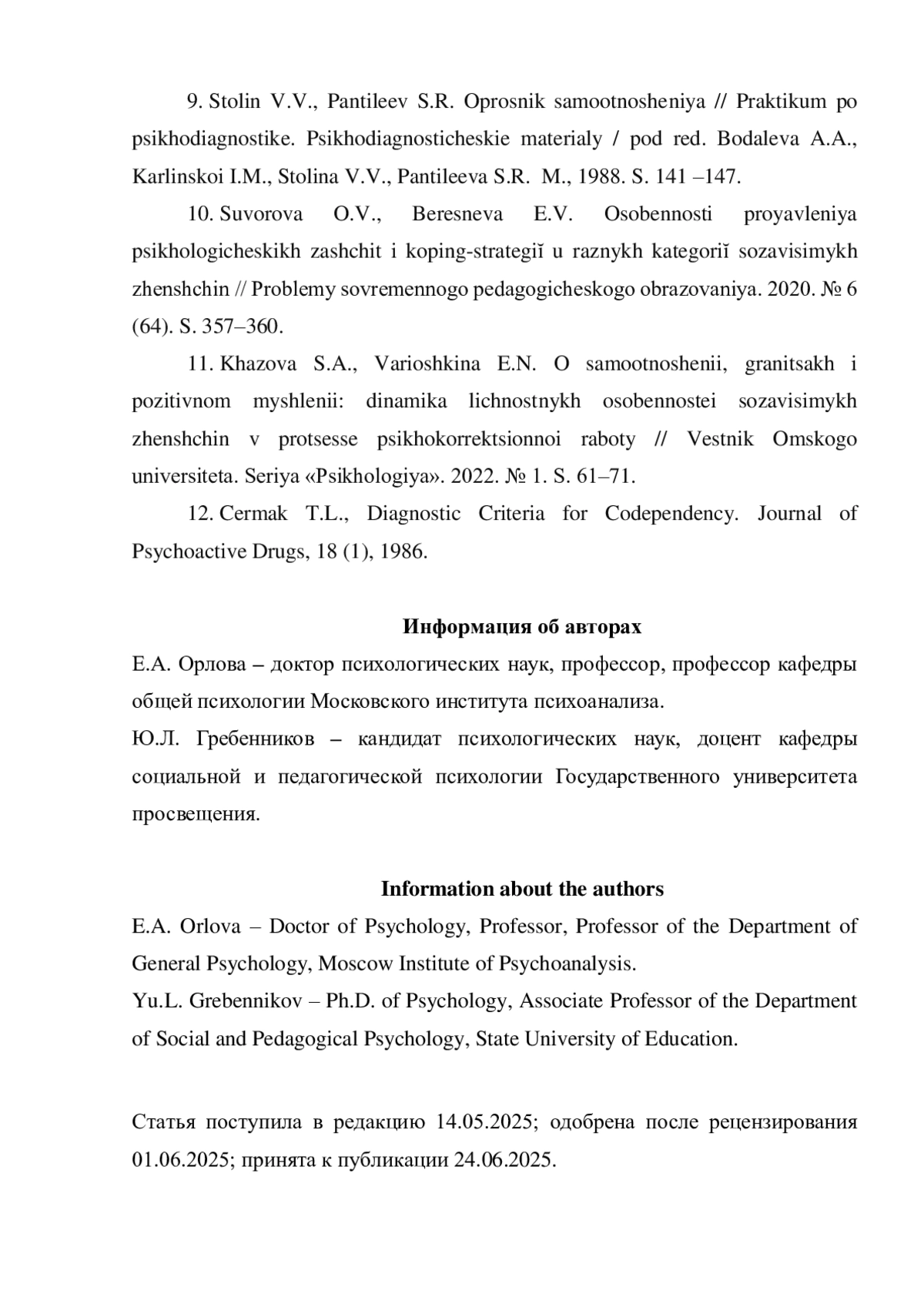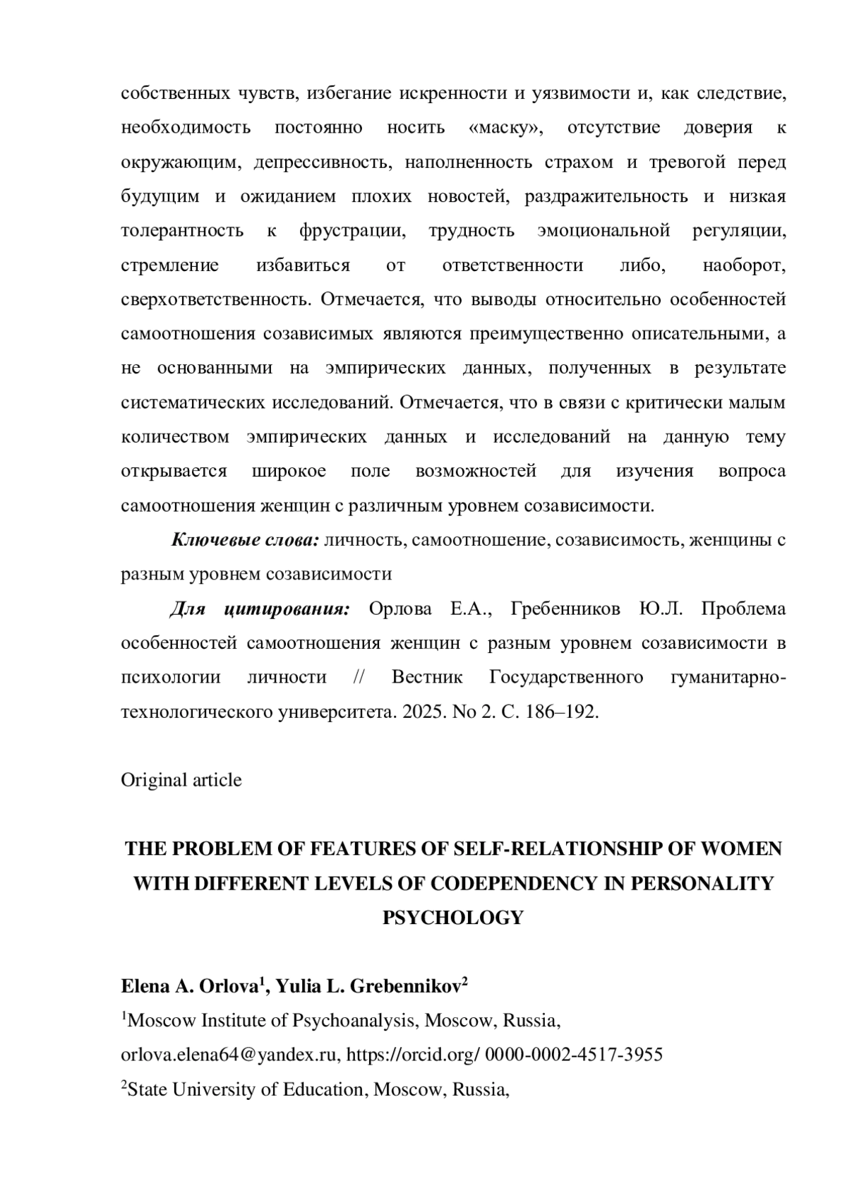 ОРЛОВА Е. А., ГРЕБЕННИКОВ Ю. Л. ПРОБЛЕМА ОСОБЕННОСТЕЙ САМООТНОШЕНИЯ ЖЕНЩИН С РАЗНЫМ УРОВНЕМ СОЗАВИСИМОСТИ В ПСИХОЛОГИИ ЛИЧНОСТИ // ВЕСТНИК ГОСУДАРСТВЕННОГО ГУМАНИТАРНО-ТЕХНОЛОГИЧЕСКОГО УНИВЕРСИТЕТА. 2025. № 2