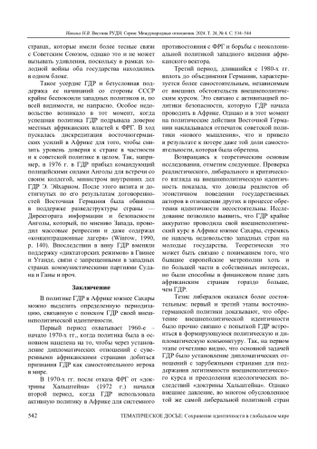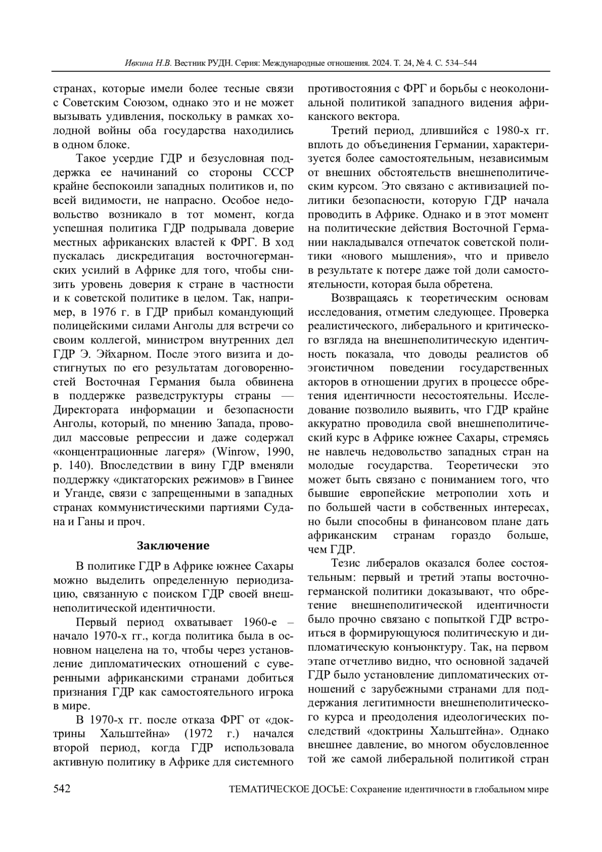 Цель исследования - выявление особенностей внешнеполитического курса ГДР в Африке южнее Сахары в контексте трех измерений: нарративного, перформативного и эмоционального. Методологически работа строится на проверке применимости двух альтернативных точек зрения: реалистской/неореалистской и либеральной - к анализу изучаемого предмета, поскольку указанные теории наполняют концепцию внешнеполитической идентичности разными смыслами. Сторонники критической теории, которая также включена в теоретический дискурс исследования, попытались пойти несколько дальше, учитывая роль формирования альянсов для идентичности государства. Научная новизна исследования определяется тем, что большинство работ по идентичности Восточной Германии описывают социологический аспект, тогда как особенности внешнеполитических инициатив остаются за скобками. В качестве базовых методов исследования выбраны историко-хронологический, который позволил не просто изучить динамику отношений между ГДР и отдельными африканскими странами, но и оценить уровень сотрудничествам между ними; сравнительно-сопоставительный метод в ряде случаев был актуален для отделения самостоятельной политики ГДР от совместных инициатив с Советским Союзом, а также для сравнения восточногерманских и западногерманских проектов на африканском направлении. Наконец, контент-анализ взаимных визитов между ГДР и африканскими странами помог установить, что рост числа визитов был обусловлен расширением сфер взаимодействия сторон - от преимущественно экономического сотрудничества до координации политики в сфере безопасности. В заключении автор приводит выводы, подтверждающие отдельные теоретические постулаты, заявленные в теоретико-методологической базе исследования, а также дает оценку всем трем измерениям внешнеполитической идентичности ГДР.