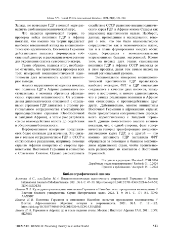 2. Ивкина Н. В. Культурно-гуманитарные отношения Германии и Намибии: опыт преодоления колониализма // Вестник Омского университета. Серия: Исторические науки. 2022. Т. 9, № 1. С. 171-181. EDN: AAXSBT