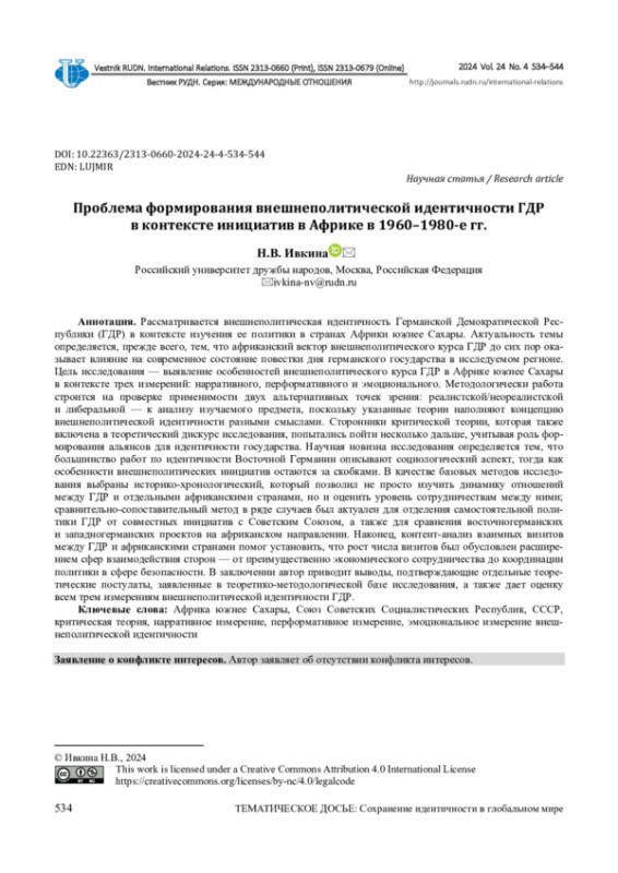 Рассматривается внешнеполитическая идентичность Германской Демократической Республики (ГДР) в контексте изучения ее политики в странах Африки южнее Сахары. Актуальность темы определяется, прежде всего, тем, что африканский вектор внешнеполитического курса ГДР до сих пор оказывает влияние на современное состояние повестки дня германского государства в исследуемом регионе.