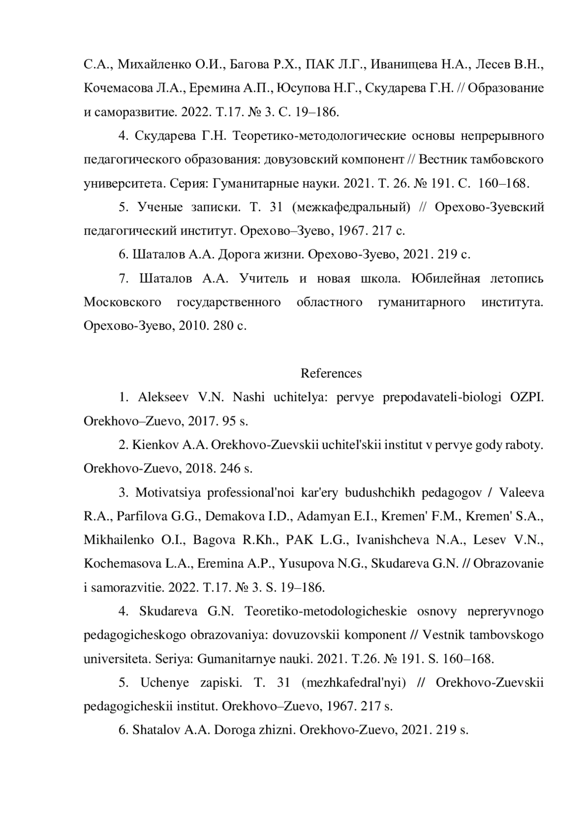 4. Скударева Г.Н. Теоретико-методологические основы непрерывного педагогического образования: довузовский компонент // Вестник тамбовского университета. Серия: Гуманитарные науки. 2021. Т. 26. № 191. С. 160-168. EDN: YZGVAE