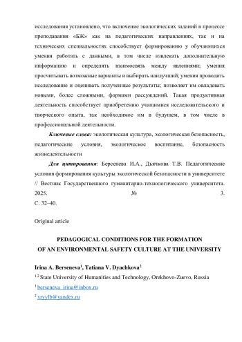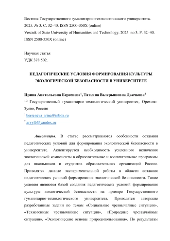 В статье рассматриваются особенности создания педагогических условий для формирования экологической безопасности в университете. Акцентируется необходимость усиленного включения экологической компоненты в образовательные и воспитательные программы для школьников и студентов образовательных организаций России. Приводятся данные экспериментальной работы в области создания педагогических условий формирования экологической безопасности. Такие условия являются базой создания педагогических условий формирования культуры экологической безопасности на примере Государственного гуманитарно-технологического университета. Приводятся авторские разработанные задачи по темам «Социальные чрезвычайные ситуации», «Техногенные чрезвычайные ситуации», «Природные чрезвычайные ситуации», «Экологические основы природопользования». По результатам исследования установлено, что включение экологических заданий в процессе преподавания «БЖ» как на педагогических направлениях, так и на технических специальностях способствует формированию у обучающихся умения работать с данными, в том числе извлекать дополнительную информацию и определять взаимосвязь между явлениями; умения просчитывать возможные варианты и выбирать наилучший; умения проводить исследование и оценивать полученные результаты; позволяет им овладевать новыми, более сложными, формами рассуждений. Такая продуктивная деятельность способствует приобретению учащимися исследовательского и творческого опыта, так необходимое им в будущем, в том числе в профессиональной деятельности.