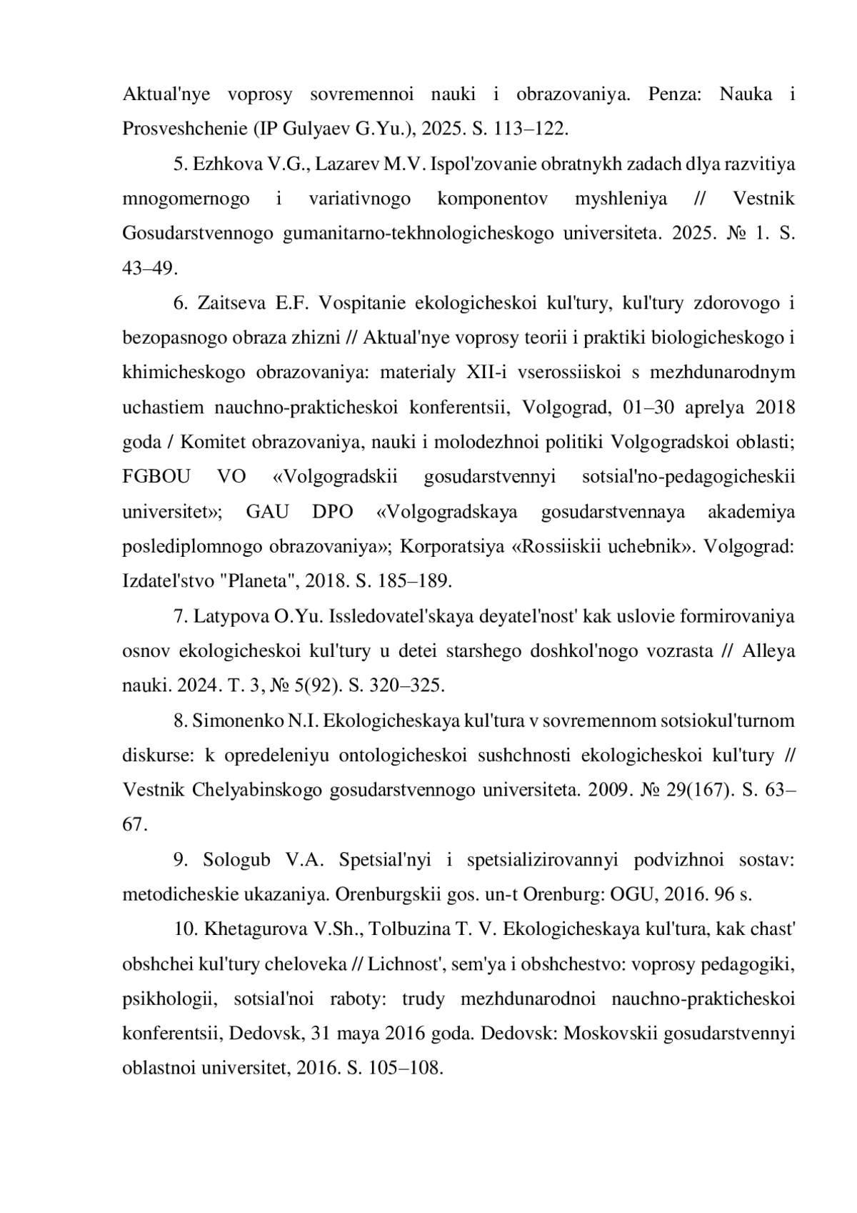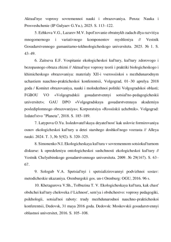 6. Зайцева Е.Ф. Воспитание экологической культуры, культуры здорового и безопасного образа жизни // Актуальные вопросы теории и практики биологического и химического образования: материалы XII-й всероссийской с международным участием научно-практической конференции, Волгоград, 01-30 апреля 2018 года / Комитет образования, науки и молодежной политики Волгоградской области; ФГБОУ ВО “Волгоградский государственный социально-педагогический университет”; ГАУ ДПО “Волгоградская государственная академия последипломного образования”; Корпорация “Российский учебник”. Волгоград: Издательство “Планета”, 2018. С. 185-189. EDN: XPDPXN