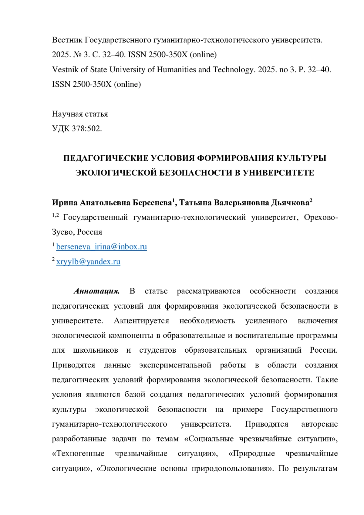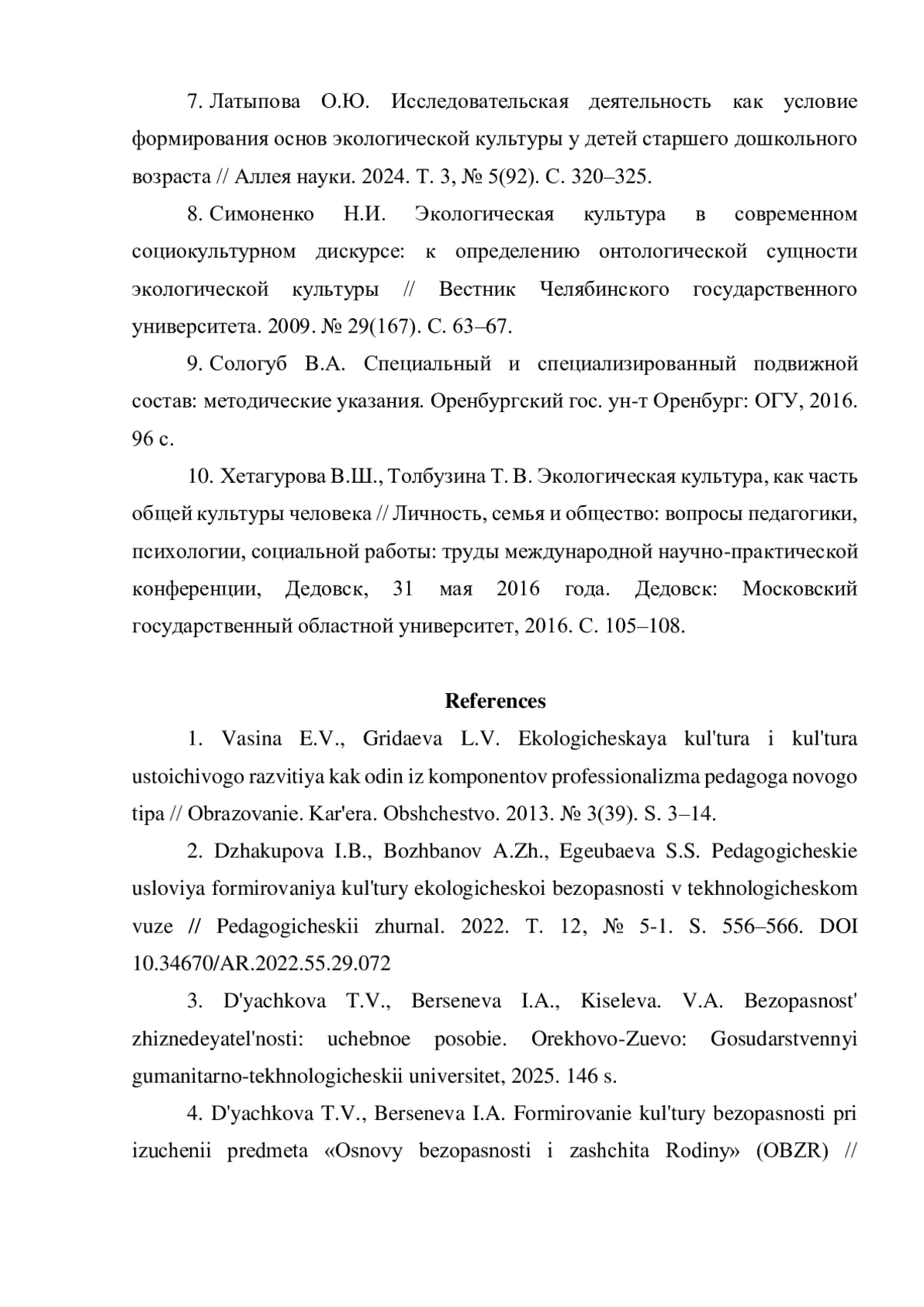 2. Джакупова И.Б., Божбанов А.Ж., Егеубаева С.С. Педагогические условия формирования культуры экологической безопасности в технологическом вузе // Педагогический журнал. 2022. Т. 12, № 5-1. С. 556-566. DOI: 10.34670/AR.2022.55.29.072 EDN: FCXROT