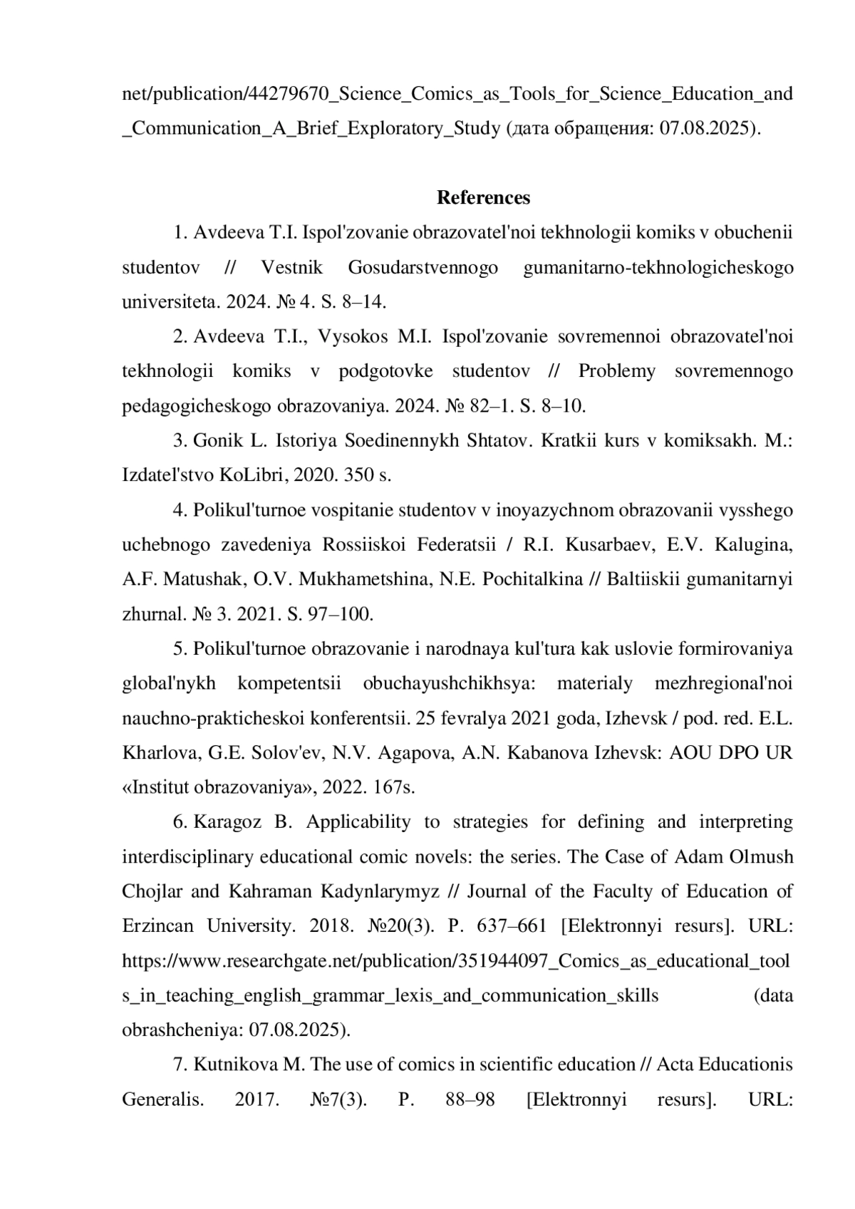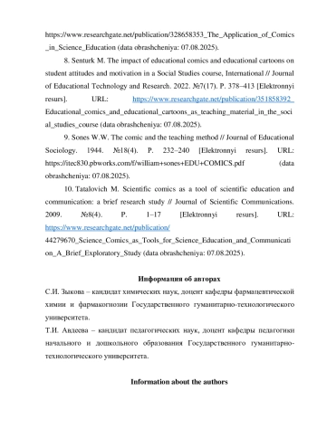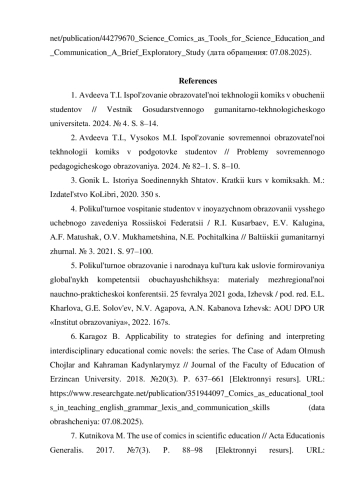 7. Kutnikova M. The use of comics in scientific education / Acta Educationis Generalis. 2017. №7(3). P. 88-98 [Электронный ресурс]. URL: https://www.researchgate.net/publication/328658353_The_Application_of_Comics_in_Science_Education(датаобращения:07.08.2025).