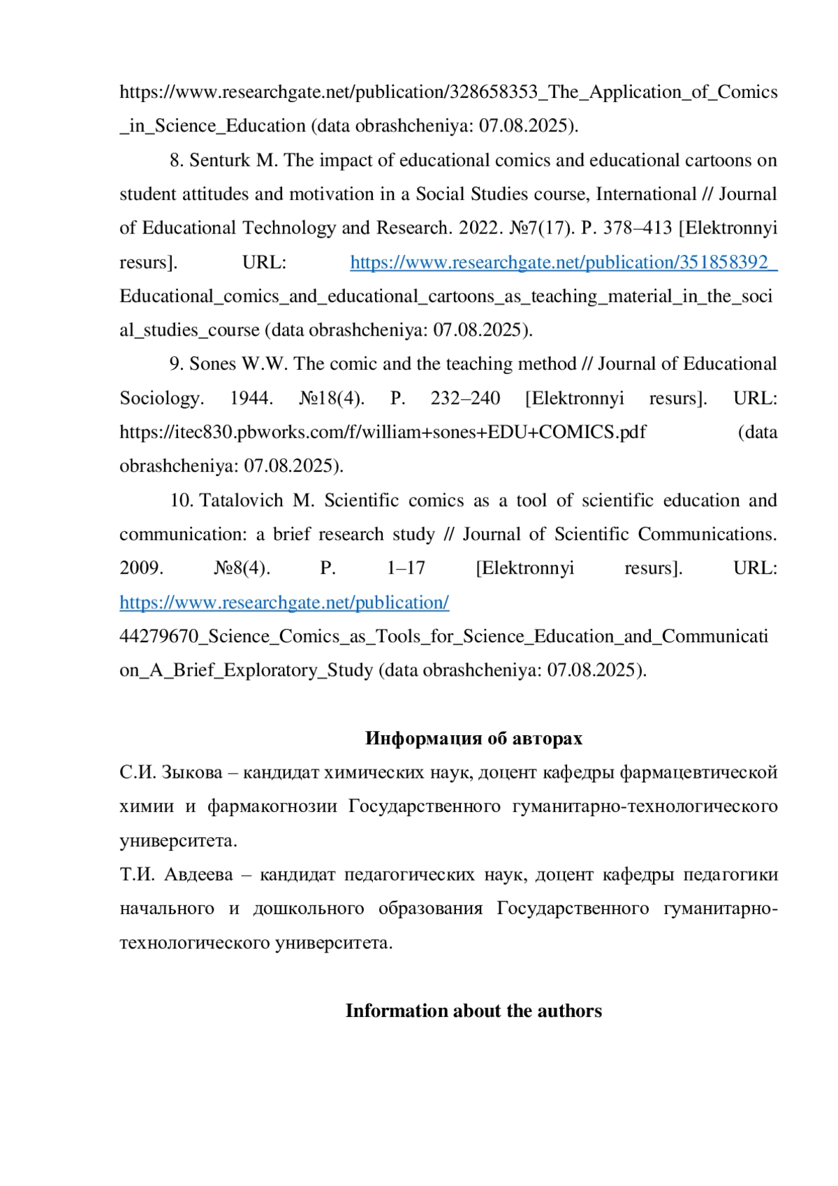 10. Tatalovich M. Scientific comics as a tool of scientific education and communication: a brief research study / Journal of Scientific Communications. 2009. №8(4). P. 1-17 [Электронный ресурс]. URL: https://www.researchgate.net/publication/44279670_Science_Comics_as_Tools_for_Science_Education_and_Communication_A_Brief_Exploratory_Study(датаобращения:07.08.2025).