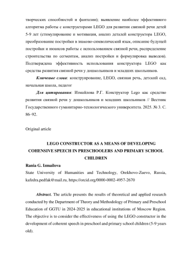 1. Армистова В.И. Развитие связной речи детей старшего дошкольного возраста с помощью Лего-конструирования // Дошкольное образование в условиях трансформационных процессов: сборник научных статей. Минск, 2023. С. 24-27. EDN: DEDJIJ