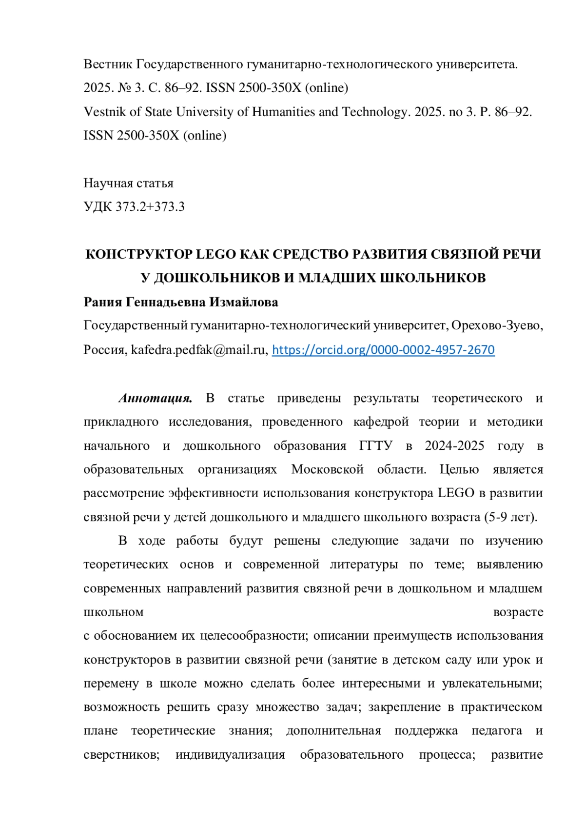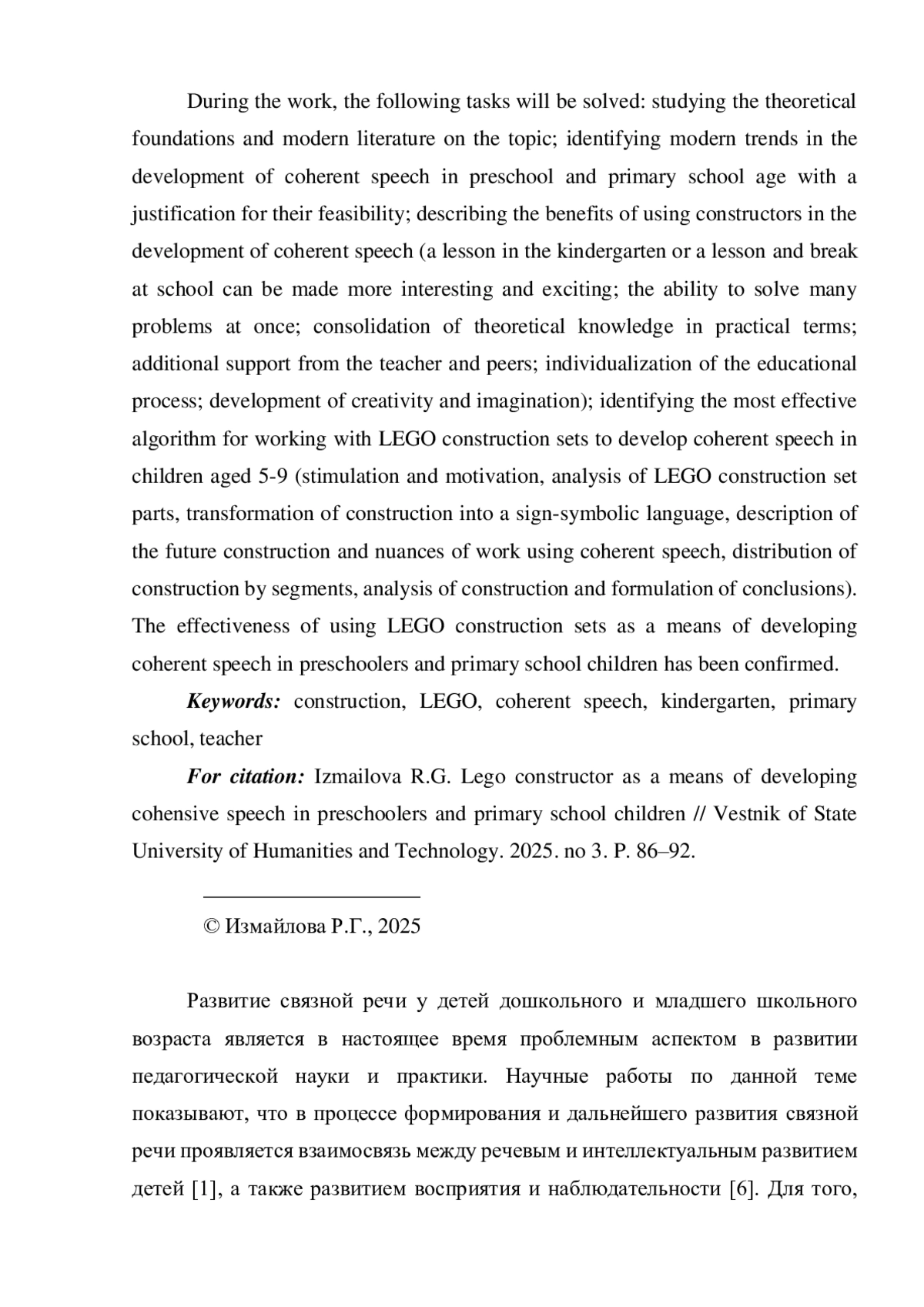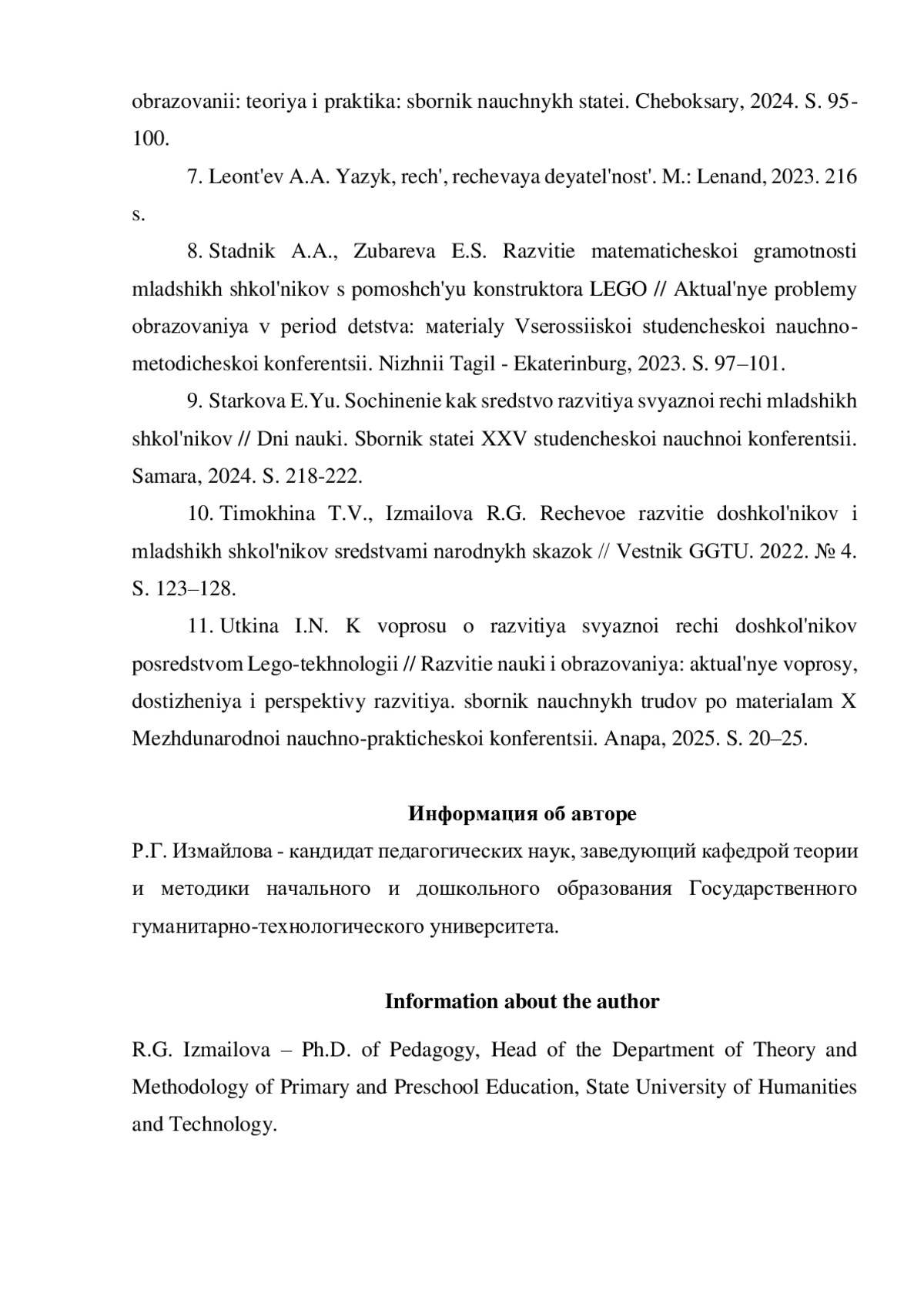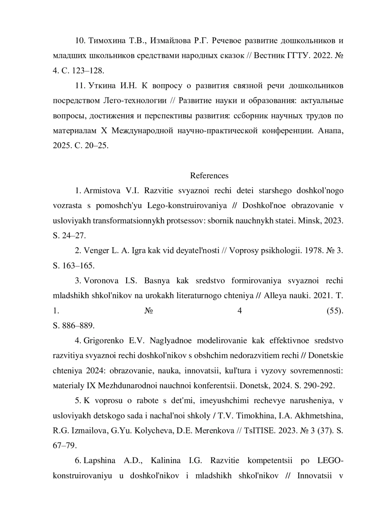 11. Уткина И.Н. К вопросу о развития связной речи дошкольников посредством Лего-технологии // Развитие науки и образования: актуальные вопросы, достижения и перспективы развития: ссборник научных трудов по материалам X Международной научно-практической конференции. Анапа, 2025. С. 20-25. EDN: MXMRWH