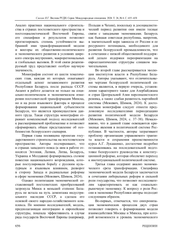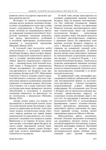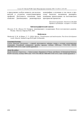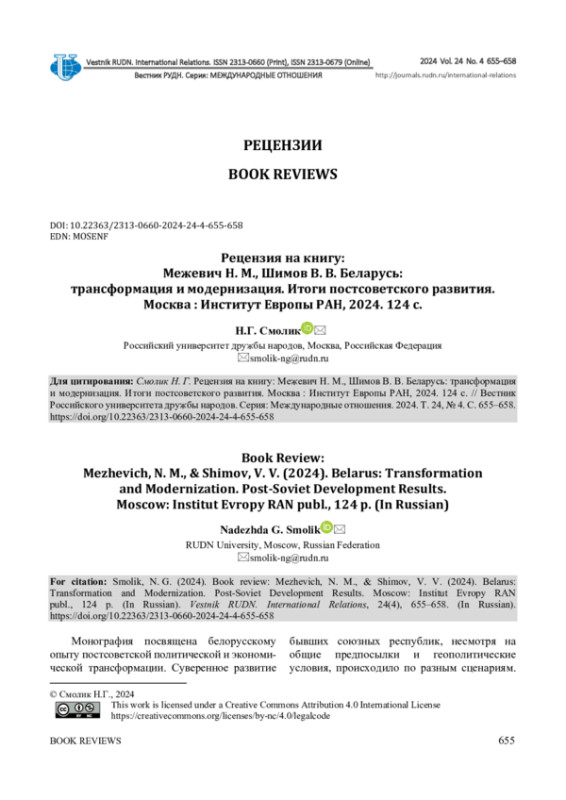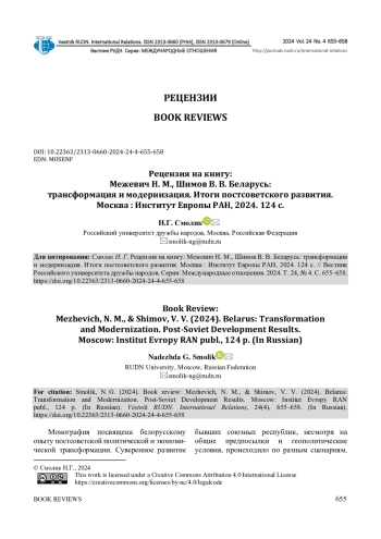 Для цитирования: Смолик Н. Г. Рецензия на книгу: Межевич Н. М., Шимов В. В. Беларусь: трансформация и модернизация. Итоги постсоветского развития. Москва: Институт Европы РАН, 2024. 124 с. // Вестник Российского университета дружбы народов. Серия: Международные отношения. 2024. Т. 24, № 4. С. 655–658. https://doi. org/10.22363/2313-0660-2024-24-4-655-658
