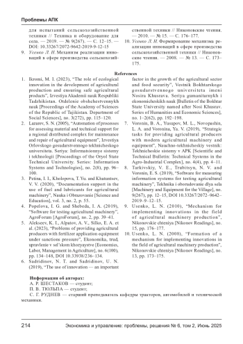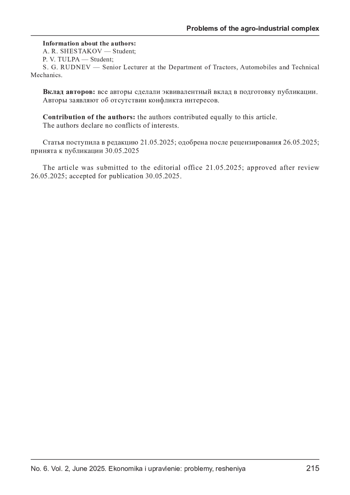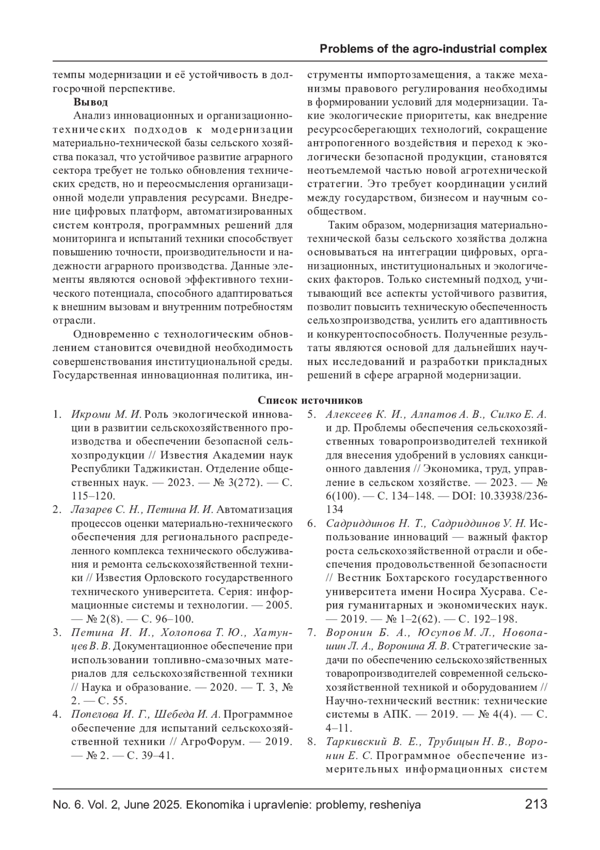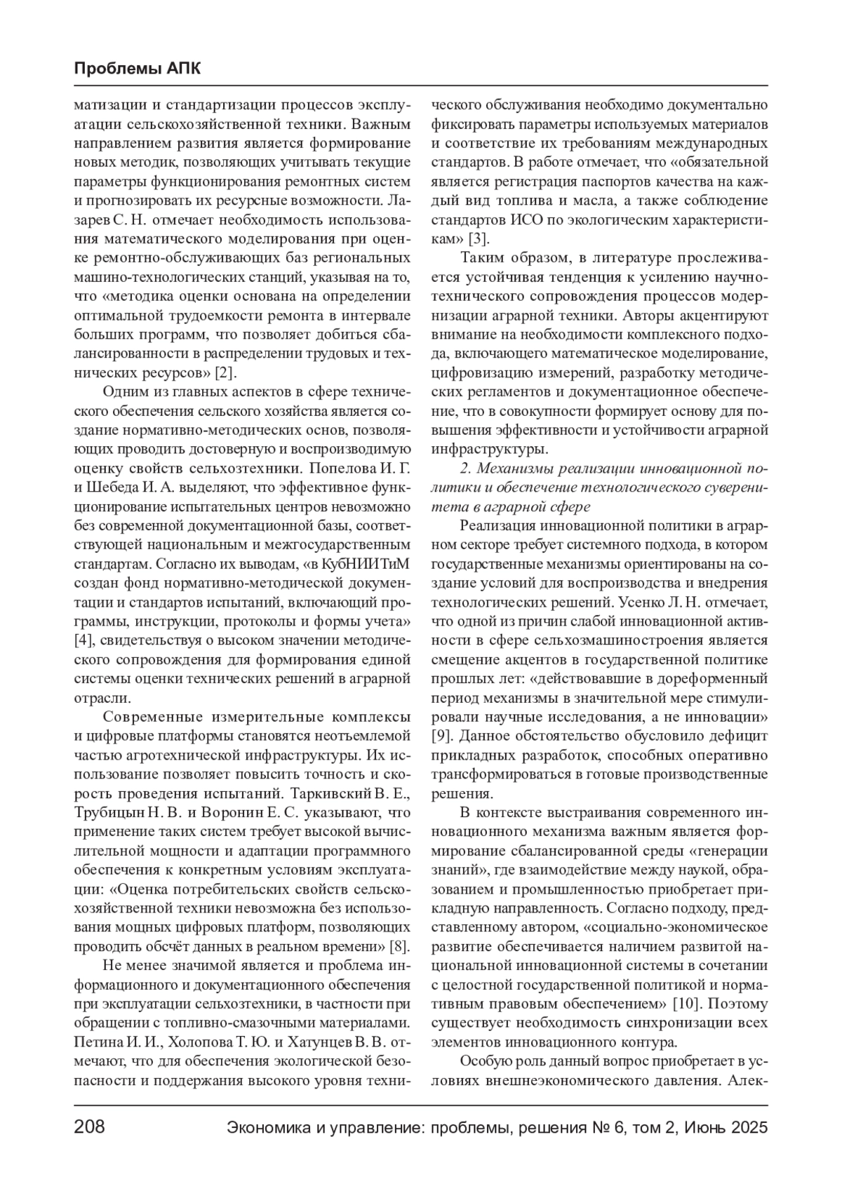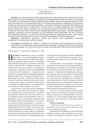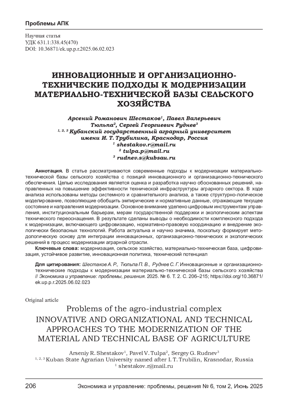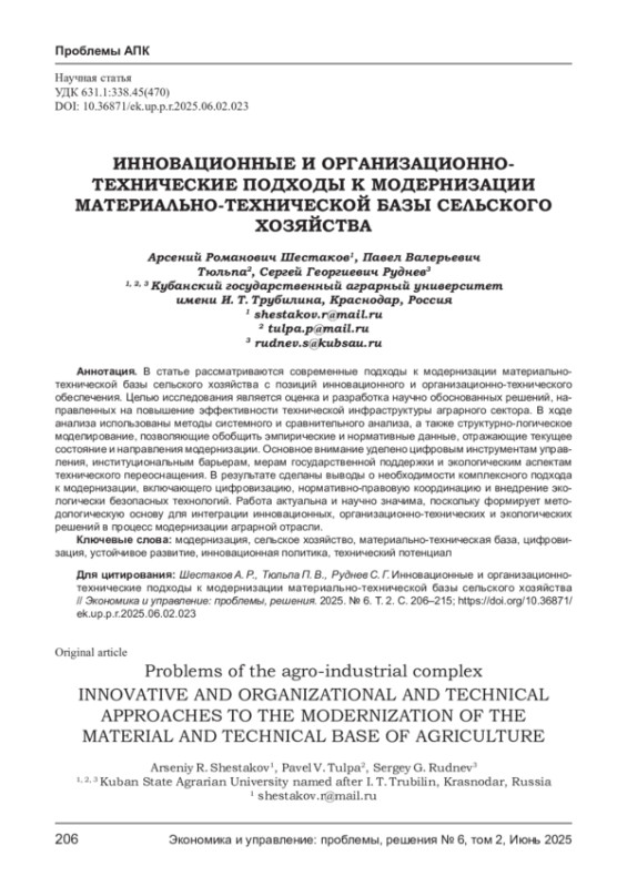 ШЕСТАКОВ А. Р., ТЮЛЬПА П. В., РУДНЕВ С. Г. ИННОВАЦИОННЫЕ И ОРГАНИЗАЦИОННО-ТЕХНИЧЕСКИЕ ПОДХОДЫ К МОДЕРНИЗАЦИИ МАТЕРИАЛЬНО-ТЕХНИЧЕСКОЙ БАЗЫ СЕЛЬСКОГО ХОЗЯЙСТВА // ЭКОНОМИКА И УПРАВЛЕНИЕ: ПРОБЛЕМЫ, РЕШЕНИЯ. 2025. ТОМ 2 № 6