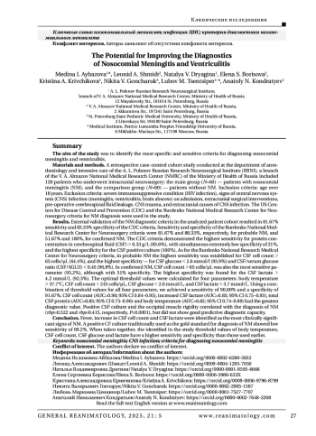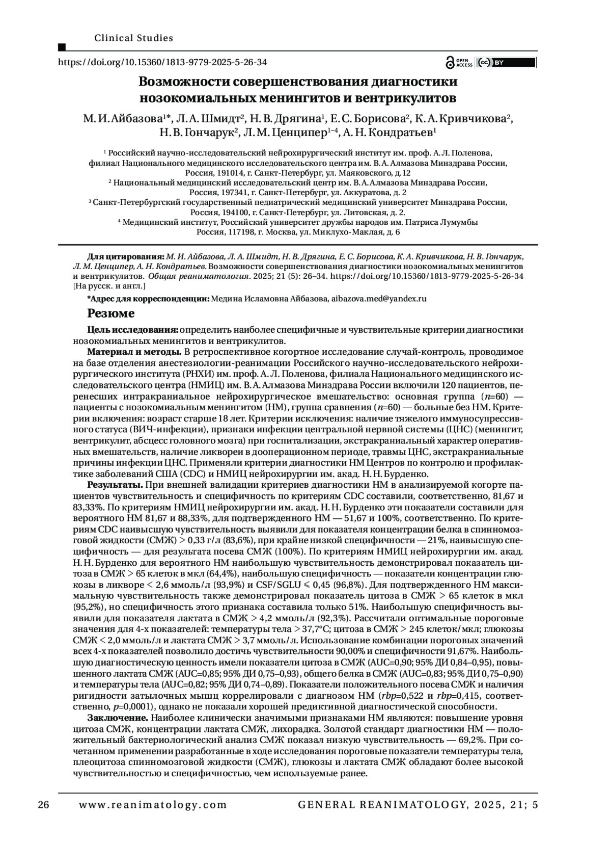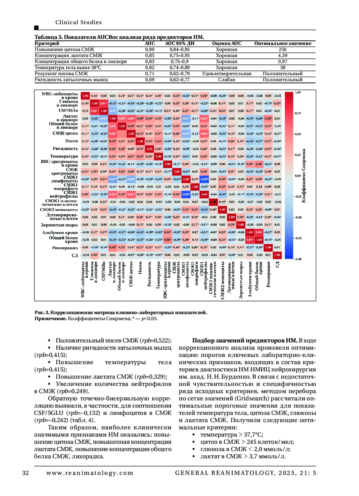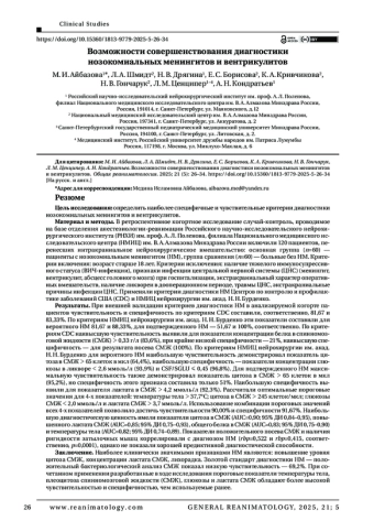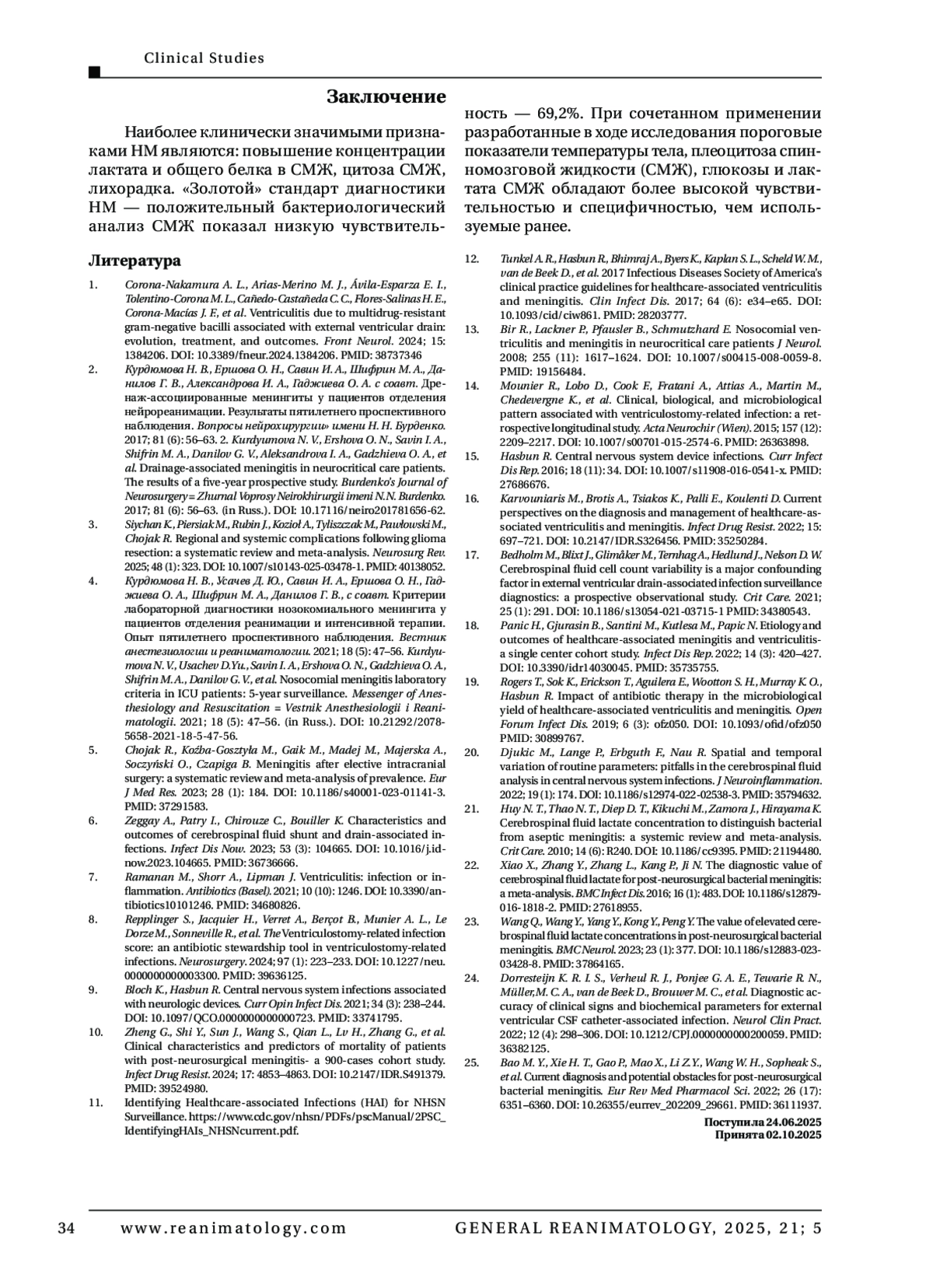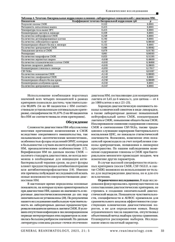 Заключение. Наиболее клинически значимыми признаками НМ являются: повышение уровня цитоза СМЖ, концентрации лактата СМЖ, лихорадка. Золотой стандарт диагностики НМ — положительный бактериологический анализ СМЖ показал низкую чувствительность — 69,2%. При сочетанном применении разработанные в ходе исследования пороговые показатели температуры тела, плеоцитоза спинномозговой жидкости (СМЖ), глюкозы и лактата СМЖ обладают более высокой чувствительностью и специфичностью, чем используемые ранее.