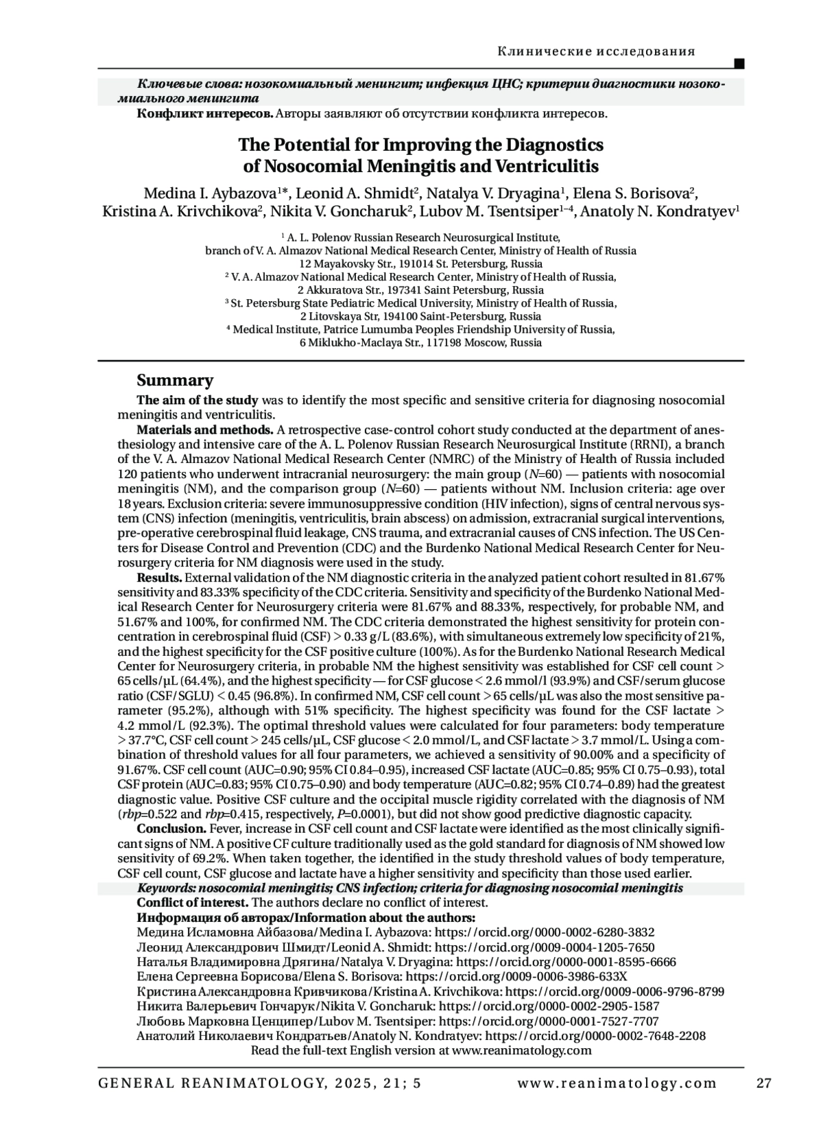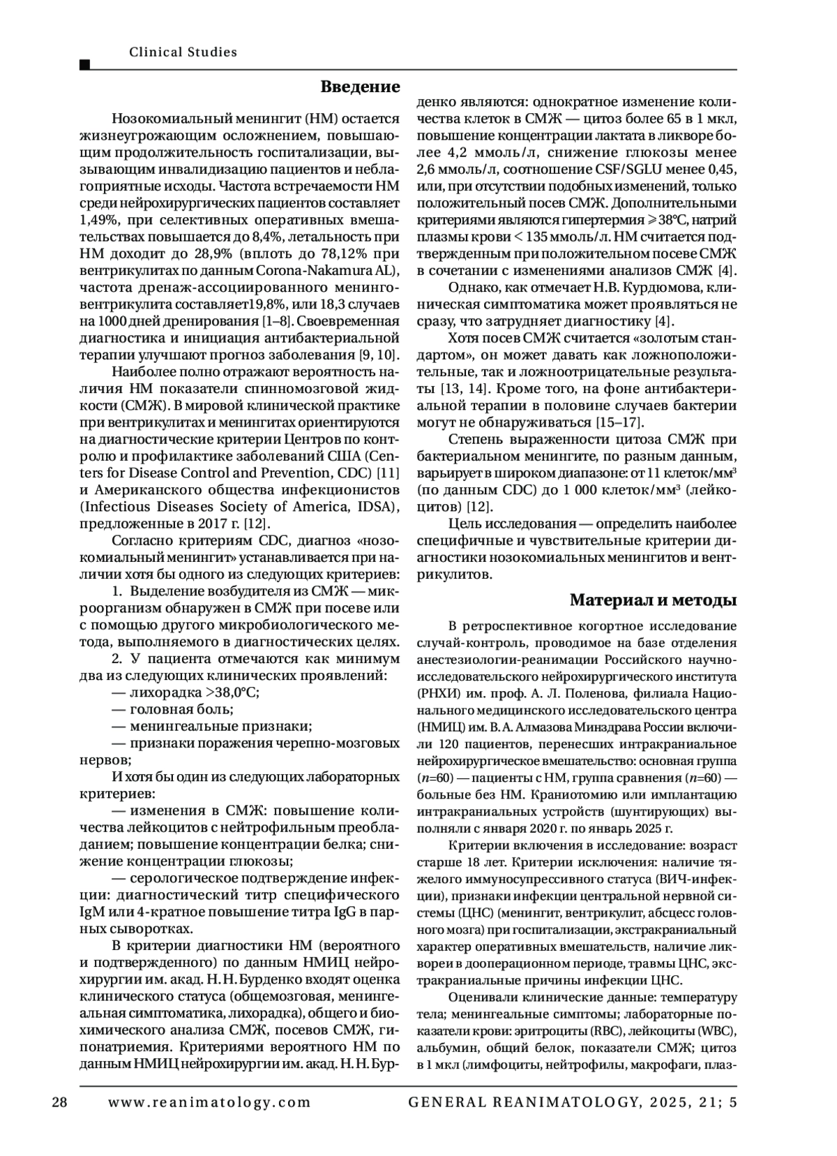 Материал и методы. В ретроспективное когортное исследование случай-контроль, проводимое на базе отделения анестезиологии-реанимации Российского научно-исследовательского нейрохирургического института (РНХИ) им. проф. А. Л. Поленова, филиала Национального медицинского исследовательского центра (НМИЦ) им. В. А. Алмазова Минздрава России включили 120 пациентов, перенесших интракраниальное нейрохирургическое вмешательство: основная группа (n=60) — пациенты с нозокомиальным менингитом (НМ), группа сравнения (n=60) — больные без НМ. Критерии включения: возраст старше 18 лет. Критерии исключения: наличие тяжелого иммуносупрессивного статуса (ВИЧ-инфекции), признаки инфекции центральной нервной системы (ЦНС) (менингит, вентрикулит, абсцесс головного мозга) при госпитализации, экстракраниальный характер оперативных вмешательств, наличие ликвореи в дооперационном периоде, травмы ЦНС, экстракраниальные причины инфекции ЦНС. Применяли критерии диагностики НМ Центров по контролю и профилактике заболеваний США (CDC) и НМИЦ нейрохирургии им. акад. Н. Н. Бурденко.