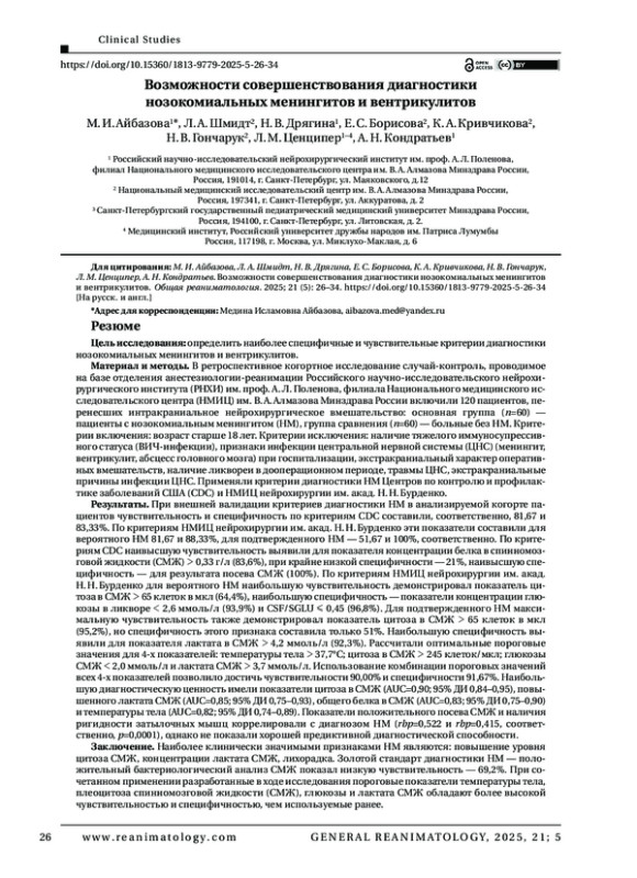 Цель исследования: определить наиболее специфичные и чувствительные критерии диагностики нозокомиальных менингитов и вентрикулитов.