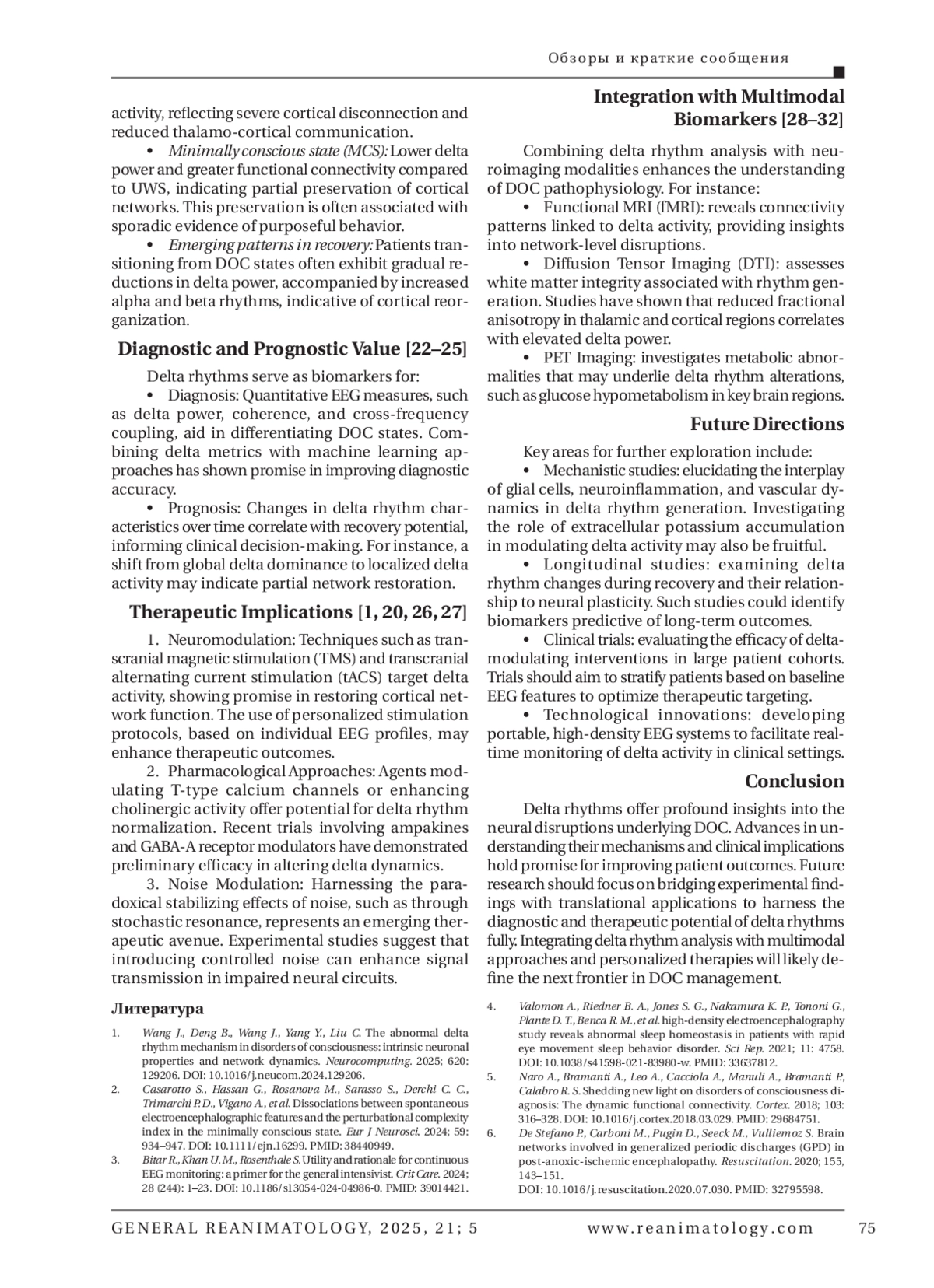 Заключение. Дельта-ритмы служат важнейшими биомаркерами состояний нарушенного сознания и представляют диагностическую, прогностическую и терапевтическую ценность. Мультимодальные подходы, объединяющие ЭЭГ, нейровизуализацию и механистические исследования, необходимы для углубления понимания и улучшения клинических результатов при лечении пациентов в состоянии нарушенного сознания.