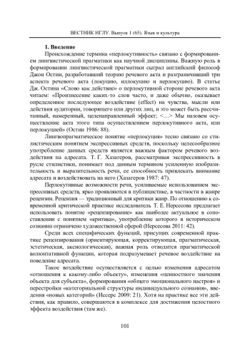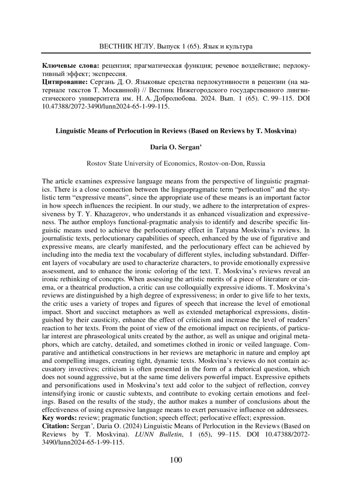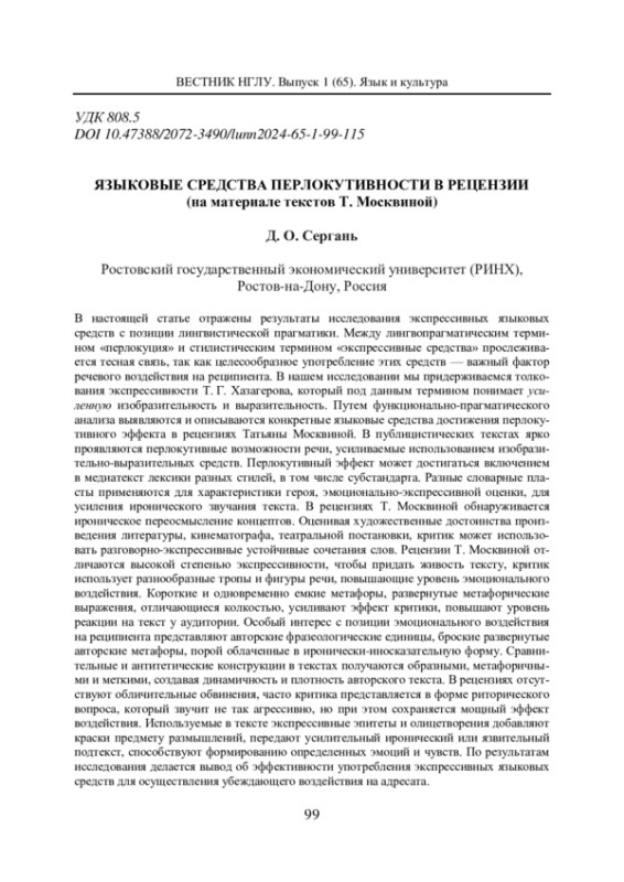 В настоящей статье отражены результаты исследования экспрессивных языковых средств с позиции лингвистической прагматики. Между лингвопрагматическим термином «перлокуция» и стилистическим термином «экспрессивные средства» прослеживается тесная связь, так как целесообразное употребление этих средств - важный фактор речевого воздействия на реципиента. В нашем исследовании мы придерживаемся толкования экспрессивности Т. Г. Хазагерова, который под данным термином понимает усиленную изобразительность и выразительность. Путем функционально-прагматического анализа выявляются и описываются конкретные языковые средства достижения перлокутивного эффекта в рецензиях Татьяны Москвиной. В публицистических текстах ярко проявляются перлокутивные возможности речи, усиливаемые использованием изобразительно-выразительных средств. Перлокутивный эффект может достигаться включением в медиатекст лексики разных стилей, в том числе субстандарта. Разные словарные пласты применяются для характеристики героя, эмоционально-экспрессивной оценки, для усиления иронического звучания текста. В рецензиях Т. Москвиной обнаруживается ироническое переосмысление концептов. Оценивая художественные достоинства произведения литературы, кинематографа, театральной постановки, критик может использовать разговорно-экспрессивные устойчивые сочетания слов. Рецензии Т. Москвиной отличаются высокой степенью экспрессивности, чтобы придать живость тексту, критик использует разнообразные тропы и фигуры речи, повышающие уровень эмоционального воздействия. Короткие и одновременно емкие метафоры, развернутые метафорические выражения, отличающиеся колкостью, усиливают эффект критики, повышают уровень реакции на текст у аудитории. Особый интерес с позиции эмоционального воздействия на реципиента представляют авторские фразеологические единицы, броские развернутые авторские метафоры, порой облаченные в иронически-иносказательную форму. Сравнительные и антитетические конструкции в текстах получаются образными, метафоричными и меткими, создавая динамичность и плотность авторского текста. В рецензиях отсутствуют обличительные обвинения, часто критика представляется в форме риторического вопроса, который звучит не так агрессивно, но при этом сохраняется мощный эффект воздействия. Используемые в тексте экспрессивные эпитеты и олицетворения добавляют краски предмету размышлений, передают усилительный иронический или язвительный подтекст, способствуют формированию определенных эмоций и чувств. По результатам исследования делается вывод об эффективности употребления экспрессивных языковых средств для осуществления убеждающего воздействия на адресата.
