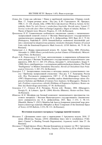10. Прокопьева Н. Н. Семантические особенности лексических единиц с эмоционально-экспрессивной пометой ironisch // Вестник Нижегородского государственного лингвистического университета им. Н. А. Добролюбова. 2019. Вып. 48. С. 75-84. EDN: USZVED