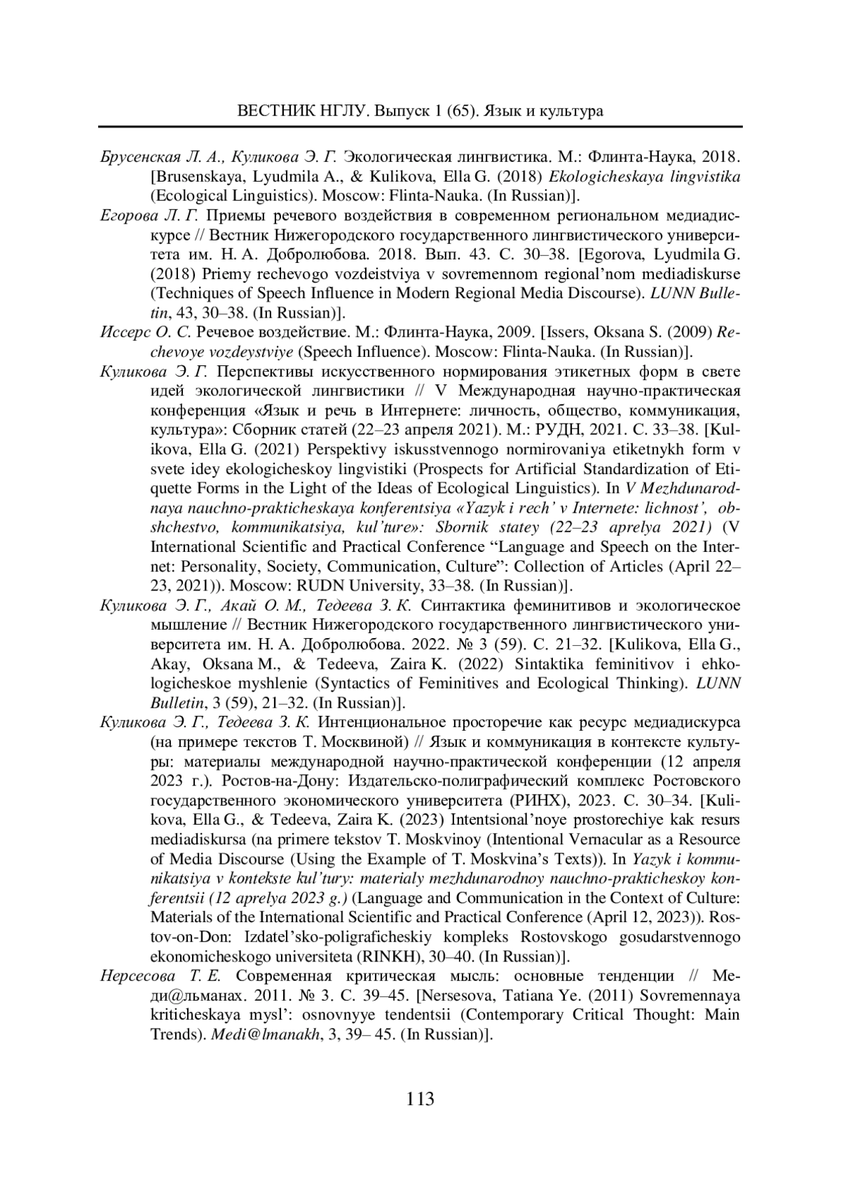 6. Куликова Э. Г., Акай О. М., Тедеева З. К. Синтактика феминитивов и экологическое мышление // Вестник Нижегородского государственного лингвистического университета им. Н. А. Добролюбова. 2022. № 3 (59). С. 21-32. EDN: UWFCIM