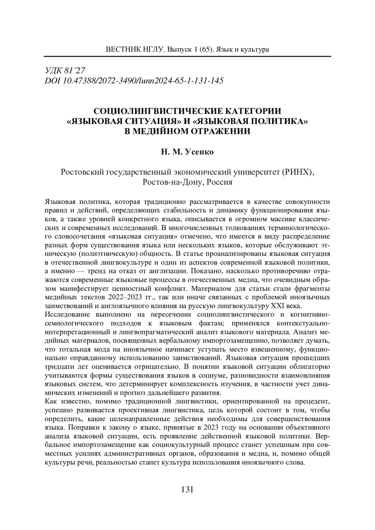 Языковая политика, которая традиционно рассматривается в качестве совокупности правил и действий, определяющих стабильность и динамику функционирования языков, а также уровней конкретного языка, описывается в огромном массиве классических и современных исследований. В многочисленных толкованиях терминологического словосочетания «языковая ситуация» отмечено, что имеется в виду распределение разных форм существования языка или нескольких языков, которые обслуживают этническую (полиэтническую) общность. В статье проанализированы языковая ситуация в отечественной лингвокультуре и один из аспектов современной языковой политики, а именно - тренд на отказ от англизации. Показано, насколько противоречиво отражаются современные языковые процессы в отечественных медиа, что очевидным образом манифестирует ценностный конфликт. Материалом для статьи стали фрагменты медийных текстов 2022-2023 гг., так или иначе связанных с проблемой иноязычных заимствований и англоязычного влияния на русскую лингвокультуру ХХI века. Исследование выполнено на пересечении социолингвистического и когнитивно-семиологического подходов к языковым фактам; применялся контекстуально-интерпретационный и лингвопрагматический анализ языкового материала. Анализ медийных материалов, посвященных вербальному импортозамещению, позволяет думать, что тотальная мода на иноязычное начинает уступать место взвешенному, функционально оправданному использованию заимствований. Языковая ситуация прошедших тридцати лет оценивается отрицательно. В понятии языковой ситуации облигаторно учитываются формы существования языков в социуме, разновидности взаимовлияния языковых систем, что детерминирует комплексность изучения, в частности учет динамических изменений и прогноз дальнейшего развития. Как известно, помимо традиционной лингвистики, ориентированной на прецедент, успешно развивается проективная лингвистика, цель которой состоит в том, чтобы определить, какие целенаправленные действия необходимы для совершенствования языка. Поправки к закону о языке, принятые в 2023 году на основании объективного анализа языковой ситуации, есть проявление действенной языковой политики. Вербальное импортозамещение как социокультурный процесс станет успешным при совместных усилиях административных органов, образования и медиа, и, помимо общей культуры речи, реальностью станет культура использования иноязычного слова.
