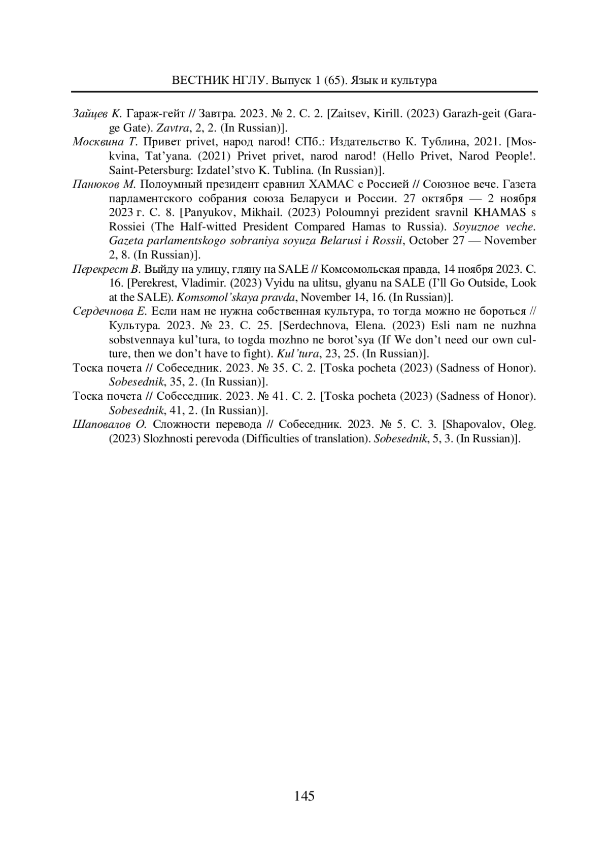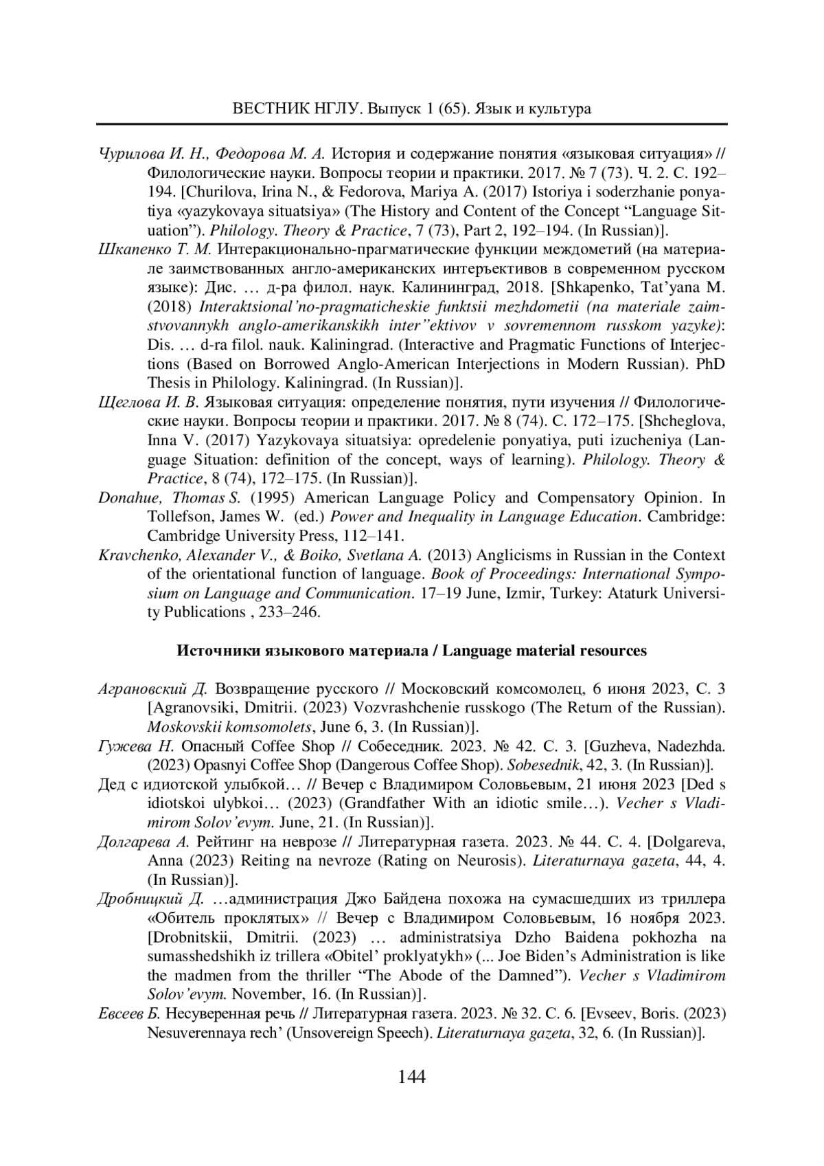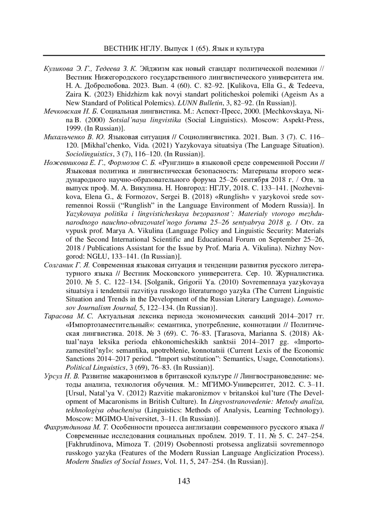 5. Бондаренко О. Р. Англизация коммуникативного пространства России: что дальше? // Вестник МГЛУ. Гуманитарные науки. 2019. № 3 (819). С. 22-34. EDN: BHIEAI