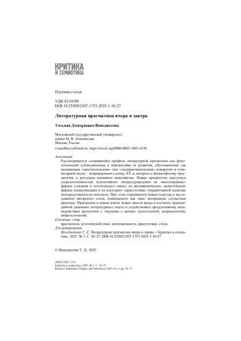 «Литературная прагматика» в отечественной науке слабо опознается как научный «бренд», хотя в европейской гуманитаристике это понятие на слуху не менее трех десятилетий 1, Впрочем, и там это направление, предполагающее применение к произведениям литературы базовых пред-ставлений лингвистической прагматики (сосредоточенность на речевых актах, принципах речевого взаимодействия и др.), не обнаруживает яркой динамики.