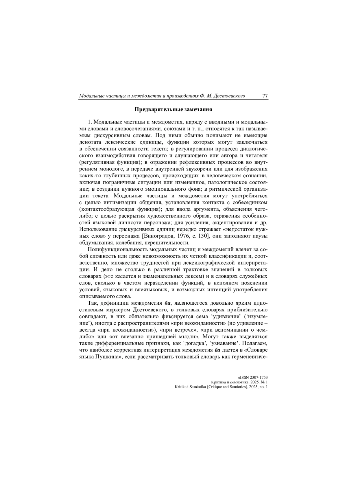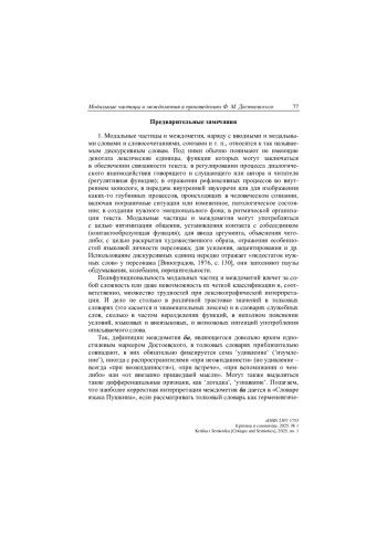 1. Модальные частицы и междометия, наряду с вводными и модальны-ми словами и словосочетаниями, союзами и т. п., относятся к так называемым дискурсивным словам. Под ними обычно понимают не имеющие денотата лексические единицы, функции которых могут заключаться в обеспечении связанности текста; в регулировании процесса диалогического взаимодействия говорящего и слушающего или автора и читателя (регулятивная функция); в отражении рефлексивных процессов во внутреннем монологе, в передаче внутренней звукоречи или для изображения каких-то глубинных процессов, происходящих в человеческом сознании, включая пограничные ситуации или измененное, патологическое состояние; в создании нужного эмоционального фона; в ритмической организации текста. Модальные частицы и междометия могут употребляться с целью интимизации общения, установления контакта с собеседником (контактообразующая функция); для ввода аргумента, объяснения чего-либо; с целью раскрытия художественного образа, отражения особенностей языковой личности персонажа; для усиления, акцентирования и др. Использование дискурсивных единиц нередко отражает «недостаток нужных слов» у персонажа [Виноградов, 1976, с. 130], они заполняют паузы обдумывания, колебания, нерешительности.