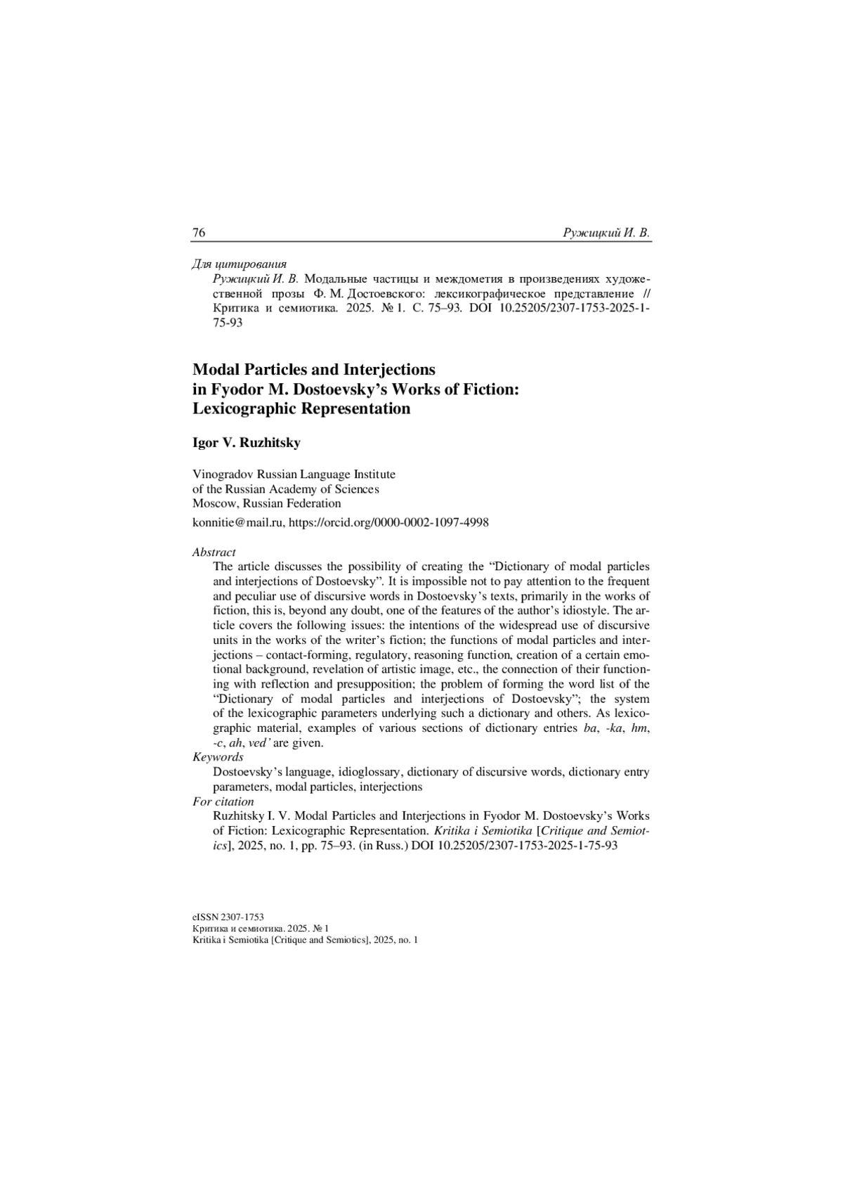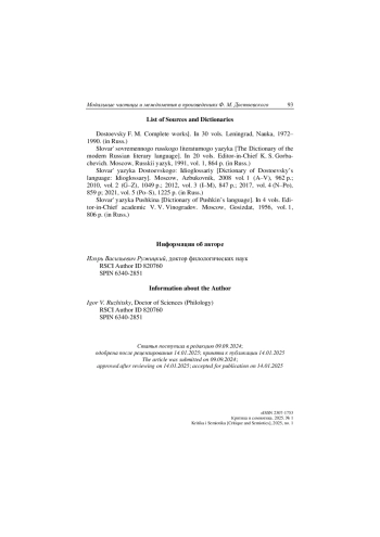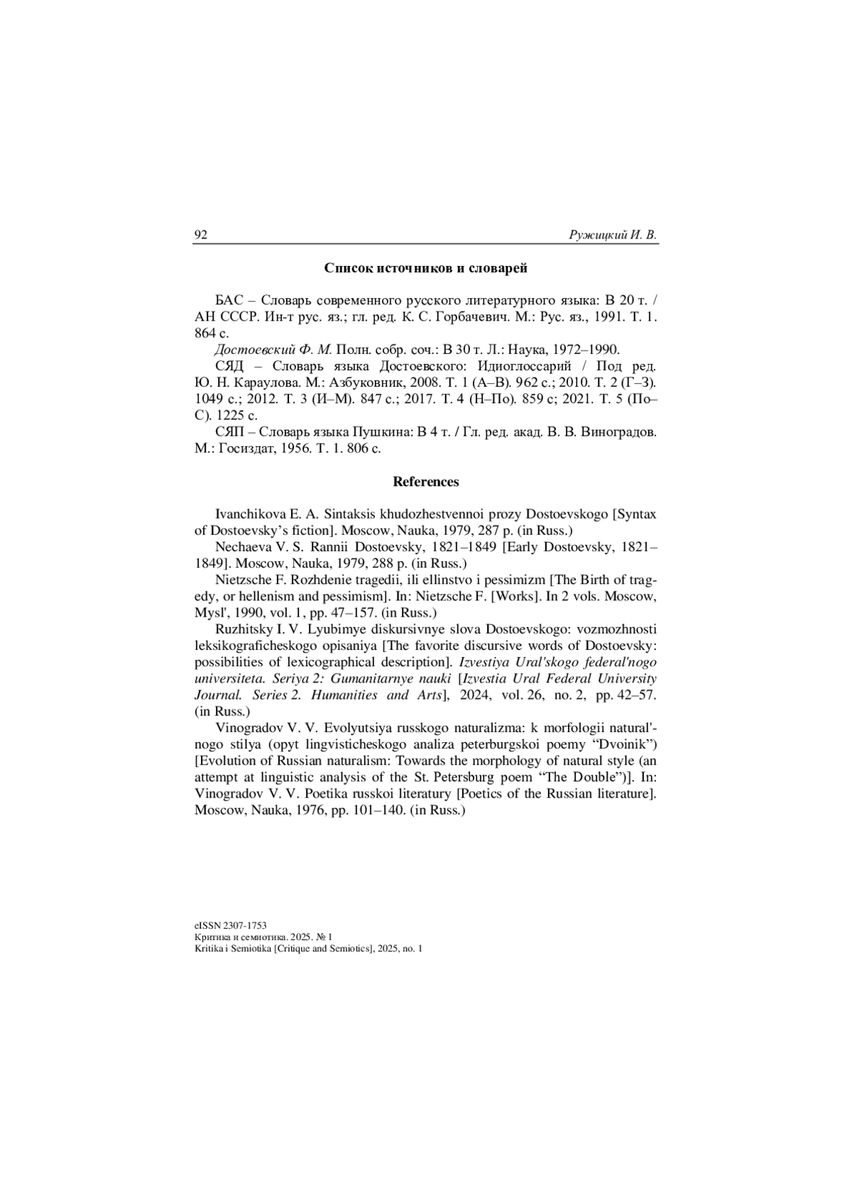 5. Ружицкий И. В. Любимые дискурсивные слова Достоевского: возможности лексикографического описания // Изв. Урал. федерал. ун-та. Серия 2: Гуманитарные науки. 2024. Т. 26, № 2. С. 42-57.