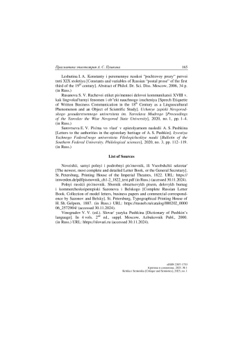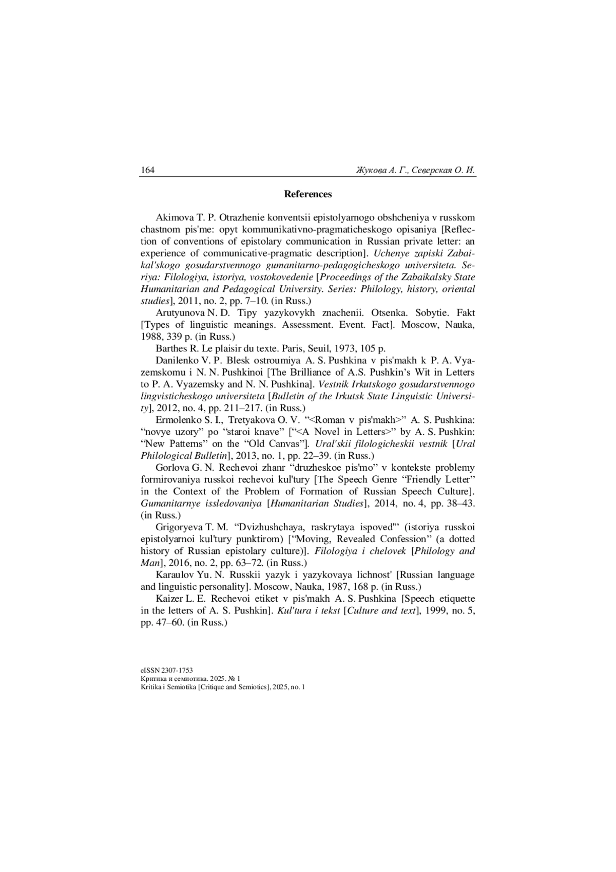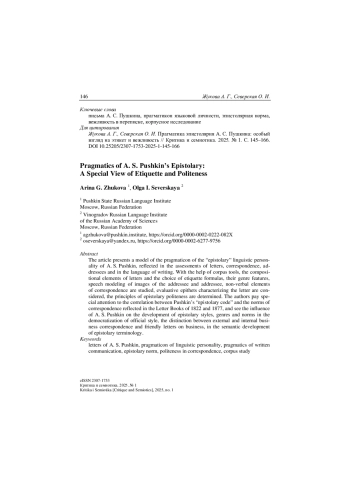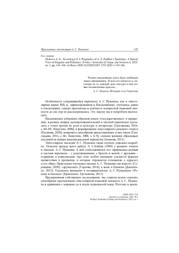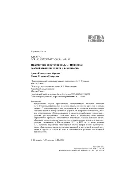 ЖУКОВА А. Г., СЕВЕРСКАЯ О. И. ПРАГМАТИКА ЭПИСТОЛЯРИЯ А. С. ПУШКИНА: ОСОБЫЙ ВЗГЛЯД НА ЭТИКЕТ И ВЕЖЛИВОСТЬ // КРИТИКА И СЕМИОТИКА. 2025. № 1