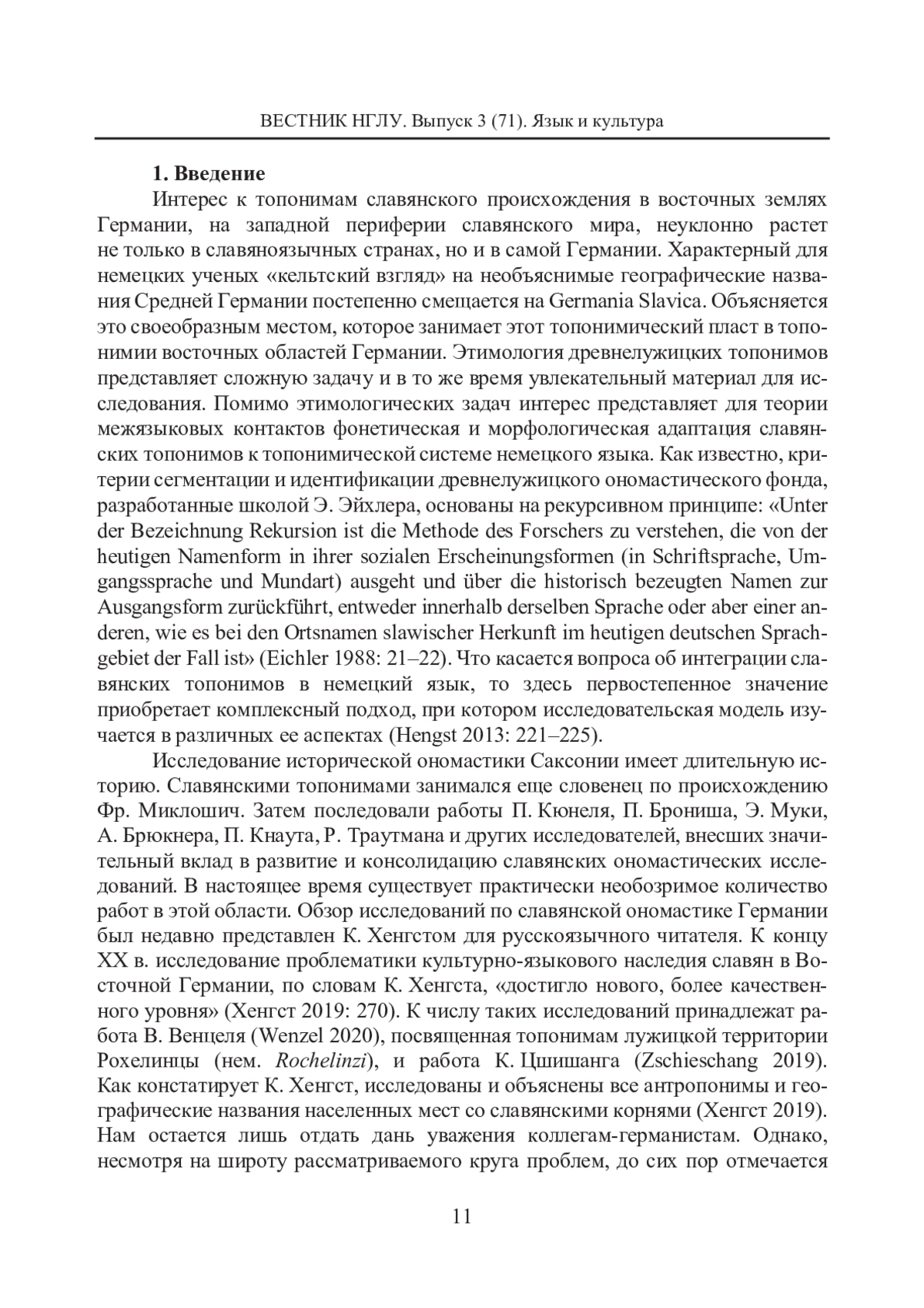 Интерес к топонимам славянского происхождения в восточных землях Германии, на западной периферии славянского мира, неуклонно растет не только в славяноязычных странах, но и в самой Германии. Характерный для немецких ученых «кельтский взгляд» на необъяснимые географические названия Средней Германии постепенно смещается на Germania Slavica. Объясняется это своеобразным местом, которое занимает этот топонимический пласт в топонимии восточных областей Германии. Этимология древнелужицких топонимов представляет сложную задачу и в то же время увлекательный материал для исследования. Помимо этимологических задач интерес представляет для теории межязыковых контактов фонетическая и морфологическая адаптация славянских топонимов к топонимической системе немецкого языка. Как известно, критерии сегментации и идентификации древнелужицкого ономастического фонда, разработанные школой Э. Эйхлера, основаны на рекурсивном принципе: «Unter der Bezeichnung Rekursion ist die Methode des Forschers zu verstehen, die von der heutigen Namenform in ihrer sozialen Erscheinungsformen (in Schriftsprache, Umgangssprache und Mundart) ausgeht und über die historisch bezeugten Namen zur Ausgangsform zurückführt, entweder innerhalb derselben Sprache oder aber einer anderen, wie es bei den Ortsnamen slawischer Herkunft im heutigen deutschen Sprachgebiet der Fall ist» (Eichler 1988: 21–22). Что касается вопроса об интеграции славянских топонимов в немецкий язык, то здесь первостепенное значение приобретает комплексный подход, при котором исследовательская модель изучается в различных ее аспектах (Hengst 2013: 221–225).