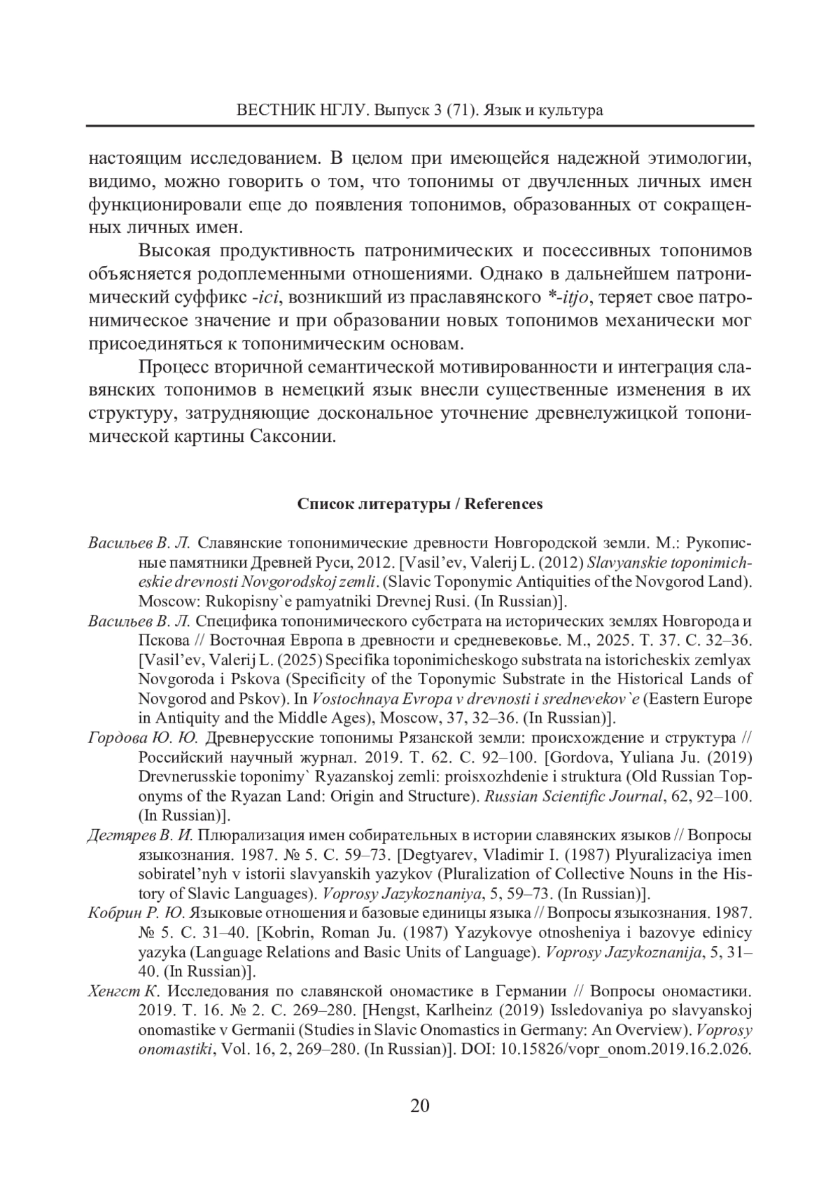 2. Васильев В. Л. Специфика топонимического субстрата на исторических землях Новгорода и Пскова // Восточная Европа в древности и средневековье. М., 2025. Т. 37. С. 32-36. EDN: HCYOOL