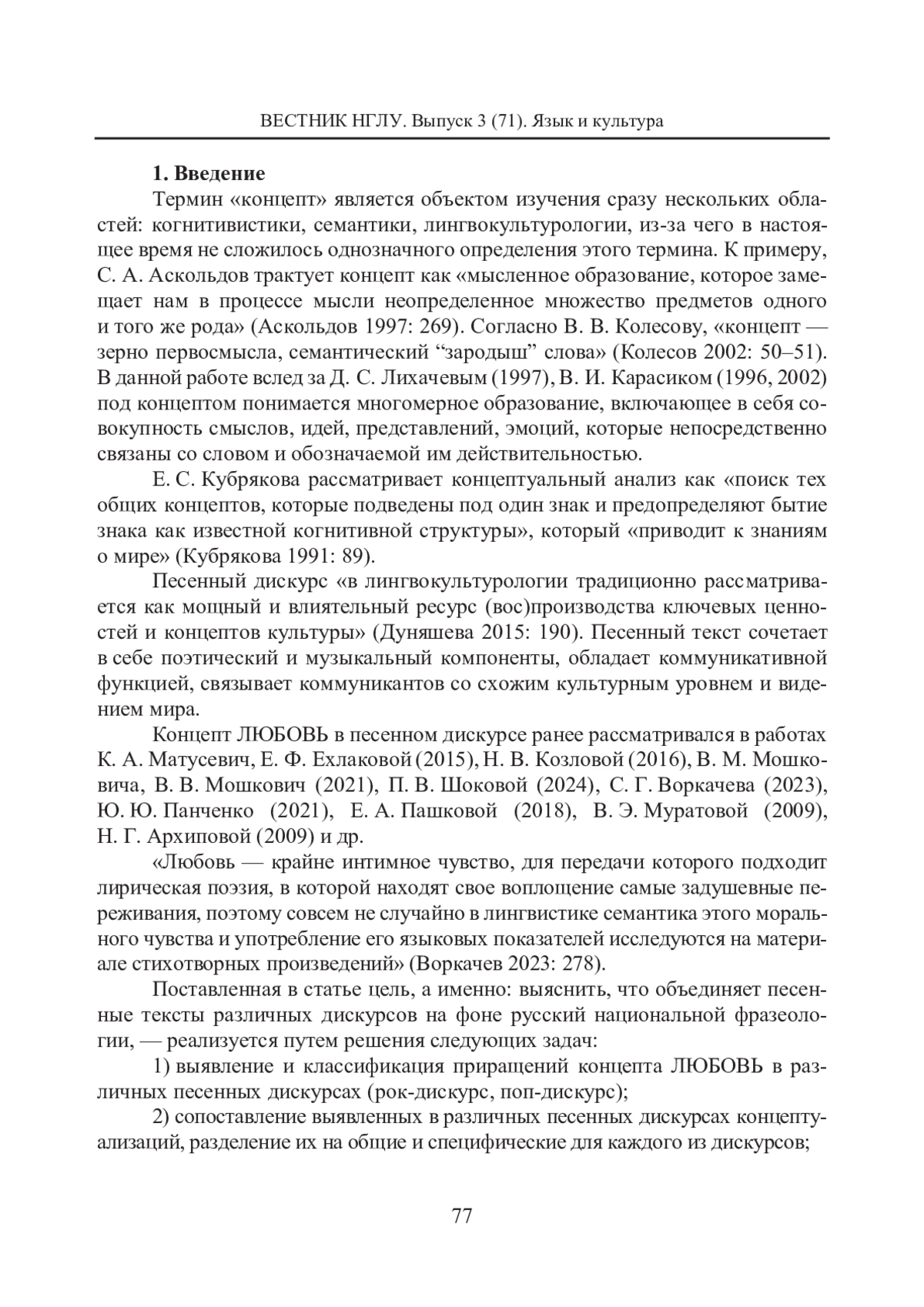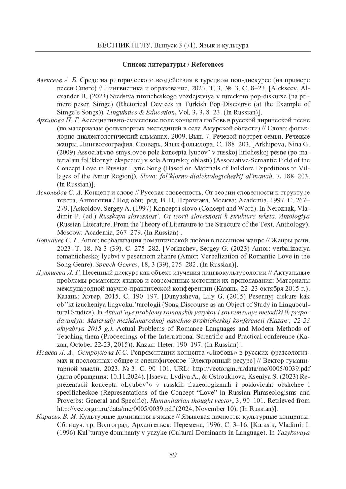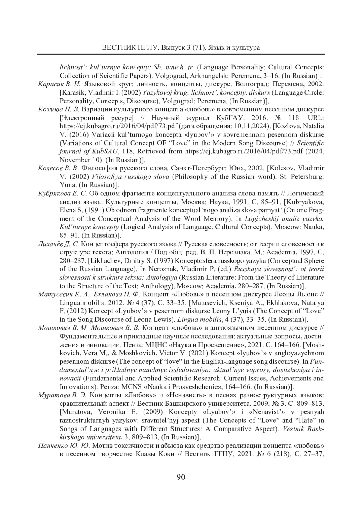 8. Козлова Н. В. Вариации культурного концепта “любовь” в современном песенном дискурсе [Электронный ресурс] // Научный журнал КубГАУ. 2016. № 118. URL: https://ej.kubagro.ru/2016/04/pdf/73.pdf (дата обращения: 10.11.2024).