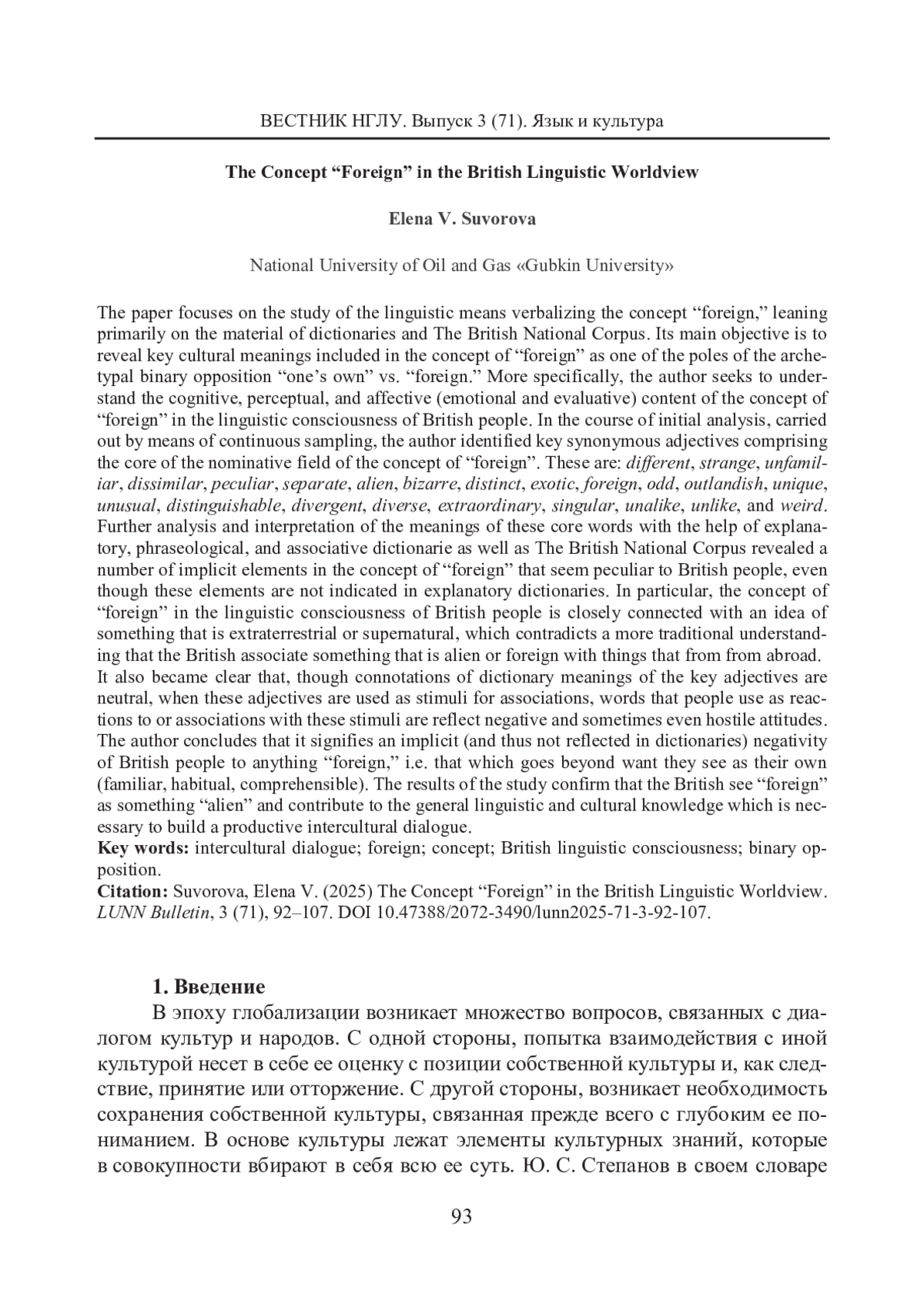 В статье рассматривается вербализация концепта FOREIGN (ЧУЖДЫЙ) на материале словарного фонда и национального корпуса английского языка (британского варианта). Цель статьи - определить ключевые культурно-маркированные смыслы, сконцентрированные в концепте FOREIGN (ЧУЖДЫЙ) как одном из полюсов архетипической бинарной оппозиции «close - foreign» («свой - чужой / чуждый»), а именно изучить когнитивное, перцептивное и аффективное (эмоционально-оценочное) наполнение концепта FOREIGN в языковом сознании британцев. В ходе первоначального анализа методом сплошной выборки были определены ключевые адъективы, составляющие ядро номинативного поля концепта FOREIGN: different, strange, unfamiliar, dissimilar, peculiar, separate, alien, bizarre, distinct, exotic, foreign, odd, outlandish, unique, unusual, distinguishable, divergent, diverse, extraordinary, singular, unalike, unlike, weird - и раскрывающие полную палитру смыслов, наполняющих данный концепт. В ходе дальнейшего исследования методом интерпретативного анализа данный синонимический ряд адъективов изучался на материале толковых, фразеологических и ассоциативного словарей, а также Британского национального корпуса. Проводимое исследование позволило выявить характерные для британского этноса особенности восприятия и интрпретации иного как чуждого, не нашедшие отражения в толковых словарях. В частности, было выявлено, что представление о чуждости в языковом сознании британцев соотнесено с внеземным и сверхъестественным, вопреки традиционному представлению о том, что британцы связывают чуждое с иноземным, иностранным. Было также замечено, что если коннотация лексикографических значений рассматриваемых адъективов, является в основном нейтральной, то слова-реакции, вступающие в ассоциативные пары с теми же адъективами-стимулами, имеют отрицательную, а в некоторых случаях крайне негативную коннотацию, что говорит об имплицитно выраженном, не нашедшем отражения в лексикографических значениях, негативном отношении британцев ко всему, что выходит за рамки своего (знакомого, привычного, понятного). Полученные результаты позволяют выявить особенности восприятия британцами иного как чуждого и, как следствие, дополнить имеющиеся лингвокультурные знания, необходимые для выстраивания межкультурного диалога.