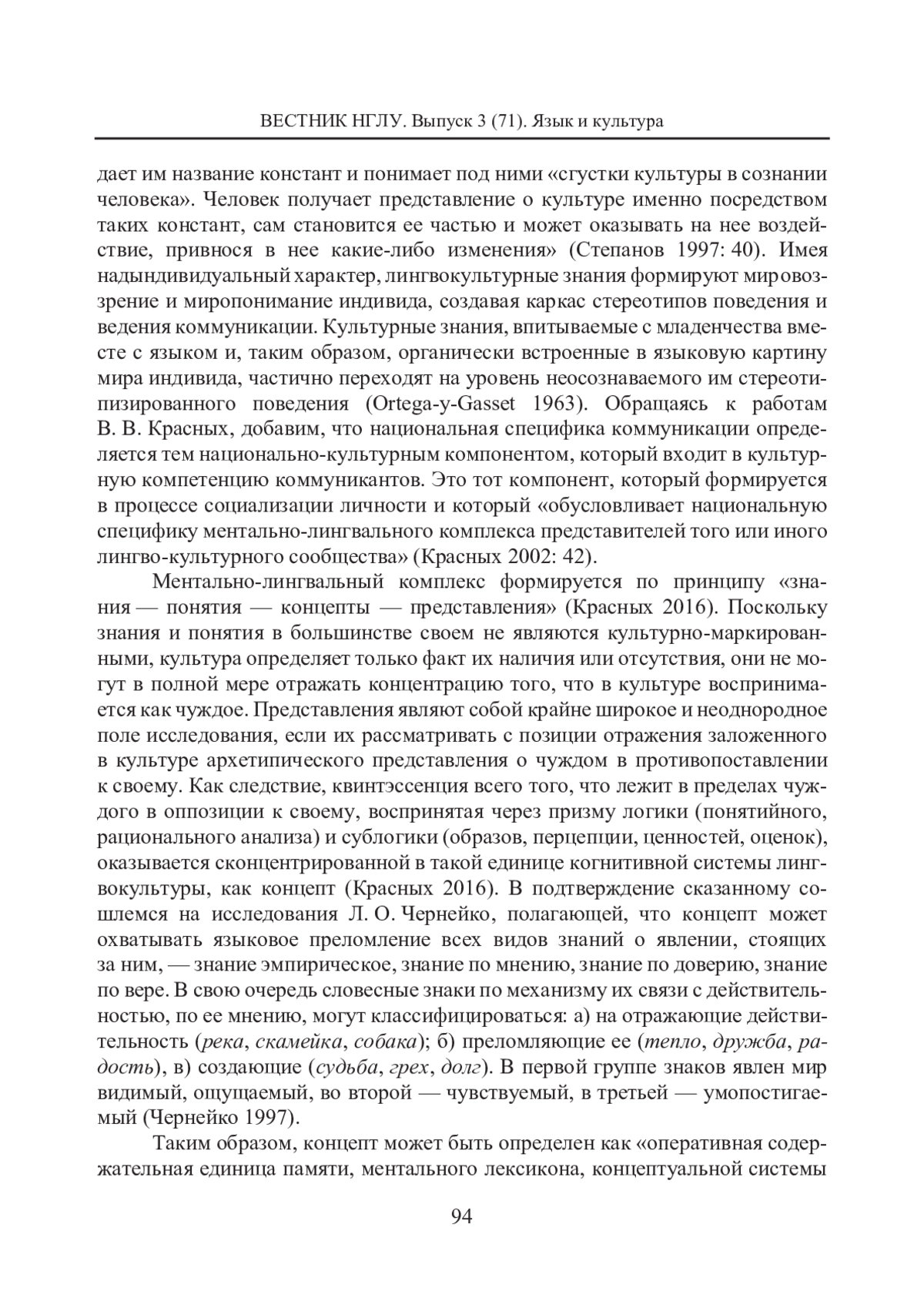 Ментально-лингвальный комплекс формируется по принципу «знания — понятия — концепты — представления» (Красных 2016). Поскольку знания и понятия в большинстве своем не являются культурно-маркированными, культура определяет только факт их наличия или отсутствия, они не могут в полной мере отражать концентрацию того, что в культуре воспринимается как чуждое. Представления являют собой крайне широкое и неоднородное поле исследования, если их рассматривать с позиции отражения заложенного в культуре архетипического представления о чуждом в противопоставлении к своему. Как следствие, квинтэссенция всего того, что лежит в пределах чуждого в оппозиции к своему, воспринятая через призму логики (понятийного, рационального анализа) и сублогики (образов, перцепции, ценностей, оценок), оказывается сконцентрированной в такой единице когнитивной системы лингвокультуры, как концепт (Красных 2016). В подтверждение сказанному сошлемся на исследования Л. О. Чернейко, полагающей, что концепт может охватывать языковое преломление всех видов знаний о явлении, стоящих за ним, — знание эмпирическое, знание по мнению, знание по доверию, знание по вере.
