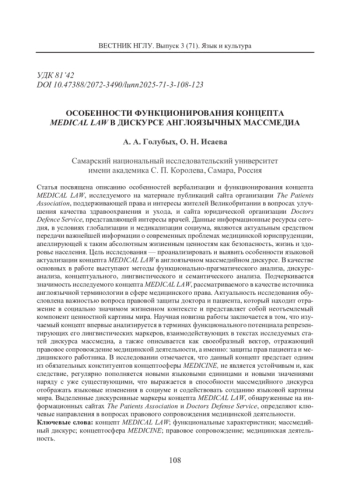 Статья посвящена описанию особенностей вербализации и функционирования концепта MEDICAL LAW, исследуемого на материале публикаций сайта организации The Patients Association, поддерживающей права и интересы жителей Великобритании в вопросах улучшения качества здравоохранения и ухода, и сайта юридической организации Doctors Defence Service, представляющей интересы врачей. Данные информационные ресурсы сегодня, в условиях глобализации и медикализации социума, являются актуальным средством передачи важнейшей информации о современных проблемах медицинской юриспруденции, апеллирующей к таким абсолютным жизненным ценностям как безопасность, жизнь и здоровье населения. Цель исследования - проанализировать и выявить особенности языковой актуализации концепта MEDICAL LAW в англоязычном массмедийном дискурсе. В качестве основных в работе выступают методы функционально-прагматического анализа, дискурс-анализа, концептуального, лингвистического и семантического анализа. Подчеркивается значимость исследуемого концепта MEDICAL LAW, рассматриваемого в качестве источника англоязычной терминологии в сфере медицинского права. Актуальность исследования обусловлена важностью вопроса правовой защиты доктора и пациента, который находит отражение в социально значимом жизненном контексте и представляет собой неотъемлемый компонент ценностной картины мира. Научная новизна работы заключается в том, что изучаемый концепт впервые анализируется в терминах функционального потенциала репрезентирующих его лингвистических маркеров, взаимодействующих в текстах исследуемых статей дискурса массмедиа, а также описывается как своеобразный вектор, отражающий правовое сопровождение медицинской деятельности, а именно: защиты прав пациента и медицинского работника. В исследовании отмечается, что данный концепт предстает одним из обязательных конституентов концептосферы MEDICINE, не является устойчивым и, как следствие, регулярно пополняется новыми языковыми единицами и новыми значениями наряду с уже существующими, что выражается в способности массмедийного дискурса отображать языковые изменения в социуме и содействовать созданию языковой картины мира. Выделенные дискурсивные маркеры концепта MEDICAL LAW, обнаруженные на информационных сайтах The Patients Association и Doctors Defense Service, определяют ключевые направления в вопросах правового сопровождения медицинской деятельности.