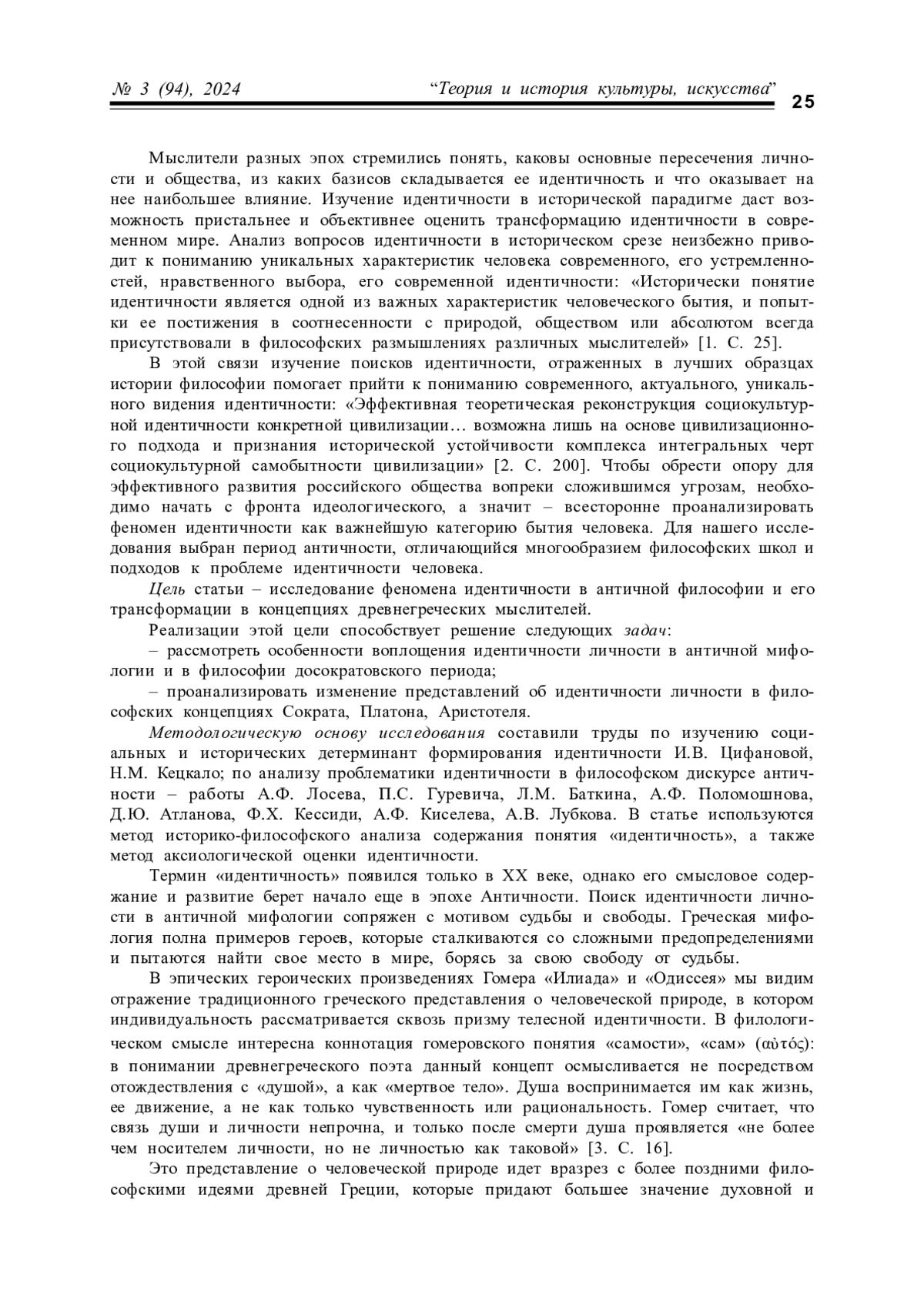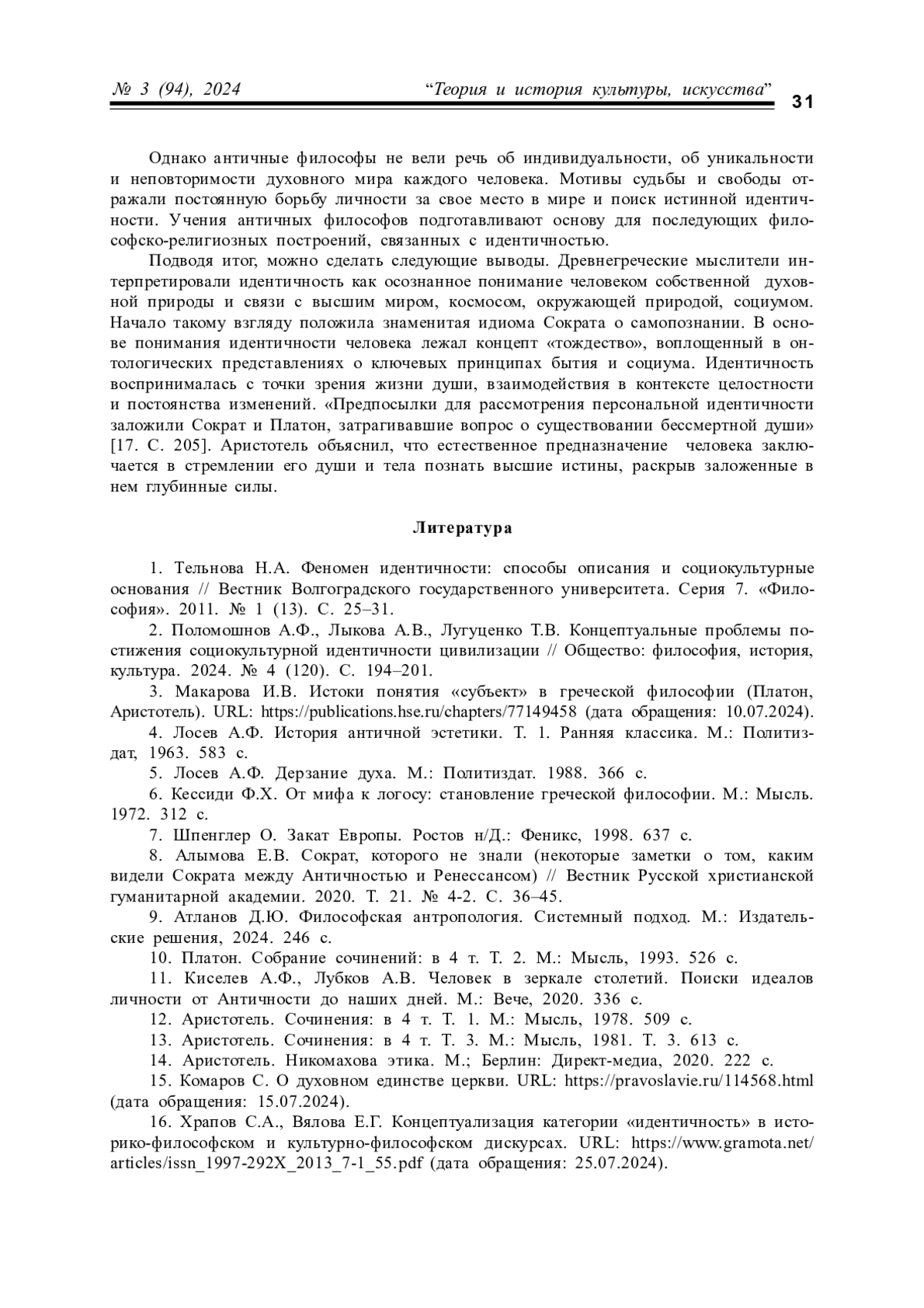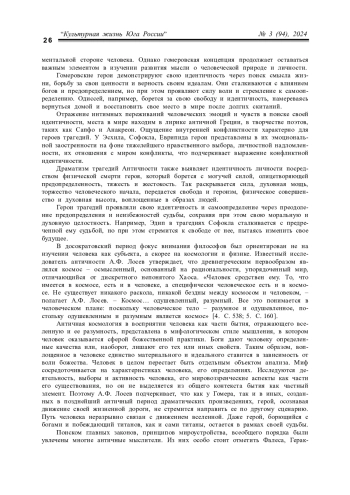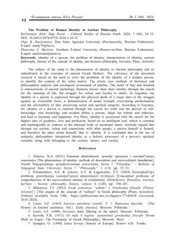 ЕМЕЛЬЯНОВА О. Б., МАСЛОВА Е. С. ПРОБЛЕМА ИДЕНТИЧНОСТИ ЧЕЛОВЕКА В АНТИЧНОЙ ФИЛОСОФИИ // КУЛЬТУРНАЯ ЖИЗНЬ ЮГА РОССИИ. 2024. № 3 (94)