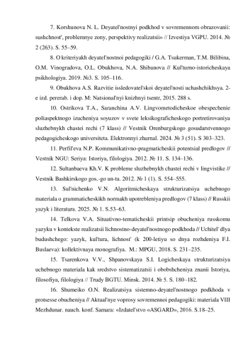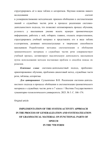 СУЛЬНИЧЕНКО В. Н. РЕАЛИЗАЦИЯ СИСТЕМНО-ДЕЯТЕЛЬНОСТНОГО ПОДХОДА В ПРОЦЕССЕ ОБОБЩЕНИЯ И СИСТЕМАТИЗАЦИИ ГРАММАТИЧЕСКОГО МАТЕРИАЛА О СЛУЖЕБНЫХ ЧАСТЯХ РЕЧИ В 7 КЛАССЕ // ВЕСТНИК ГОСУДАРСТВЕННОГО ГУМАНИТАРНО-ТЕХНОЛОГИЧЕСКОГО УНИВЕРСИТЕТА. 2025. № 3