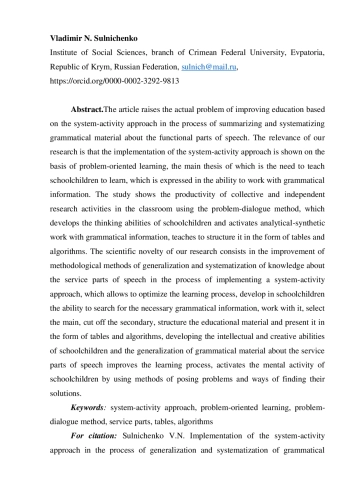 В статье поднимается актуальная проблема совершенствования обучения на основе системно-деятельностного подхода в процессе обобщения и систематизации грамматического материала о служебных частях речи. Актуальность нашего исследования в том, что реализация системно-деятельностного подхода показана на базе проблемно-ориентированного обучения, главным тезисом которого является необходимость научить школьников учиться, что выражается в умении работать с грамматической информацией. В исследовании показана продуктивность коллективной и самостоятельной исследовательской деятельности на уроке с использованием проблемно-диалогового метода, который развивает мыслительные способности школьников и активизирует аналитико-синтетическую работу с грамматической информацией, учит структурировать её в виде таблиц и алгоритмов. Научная новизна нашего исследования состоит в усовершенствовании методических приемов обобщения и систематизации знаний о служебных частях речи в процессе реализации системно-деятельностного подхода, что позволяет оптимизировать процесс обучения, развивать у школьников умение искать нужную грамматическую информацию, работать с ней, отбирать главное, отсекать второстепенное, структурировать учебный материал и представлять его в виде таблиц и алгоритмов, развивая интеллектуальные и творческие способности школьников Разработанная методика систематизации и обобщения грамматического материала о служебных частях речи совершенствует учебный процесс, активизирует мыслительную деятельность школьников путем использования методов постановки проблем и способов поиска их решения.