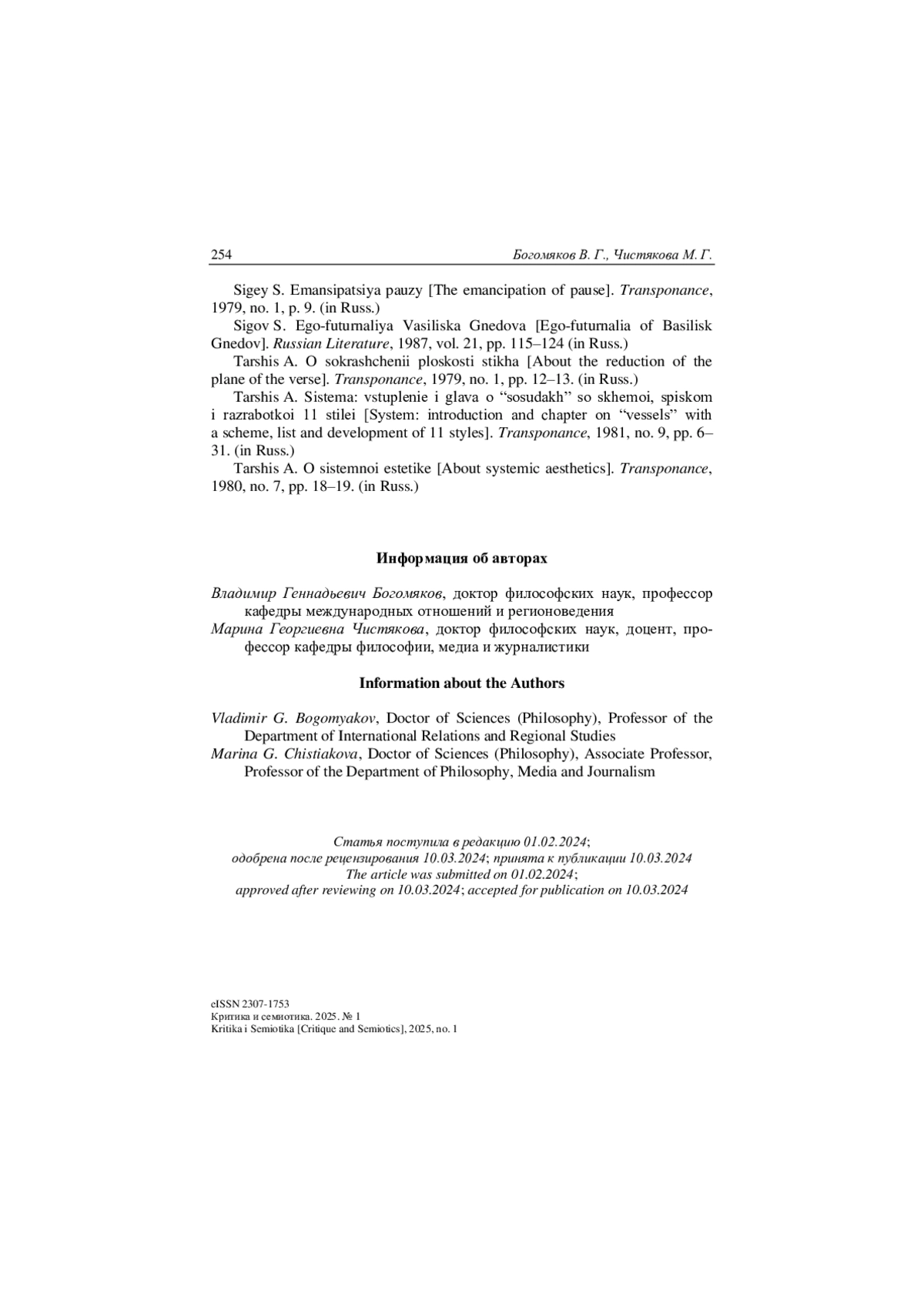 БОГОМЯКОВ В. Г., ЧИСТЯКОВА М. Г. ПУСТОТА В ПОЭЗИИ РУССКОГО АВАНГАРДА: ОТ ТРАНСЦЕНДЕНТАЛЬНОЙ БУФФОНАДЫ К «ВАКУУМНОЙ ПОЭЗИИ» // КРИТИКА И СЕМИОТИКА. 2025. № 1