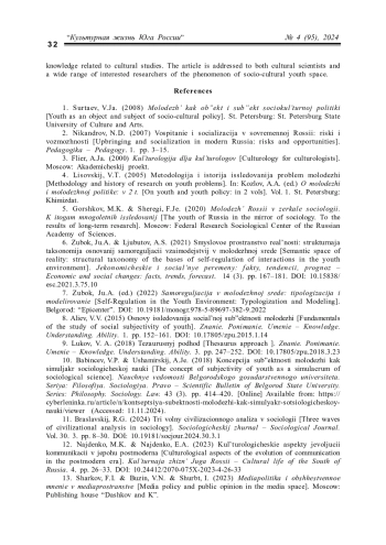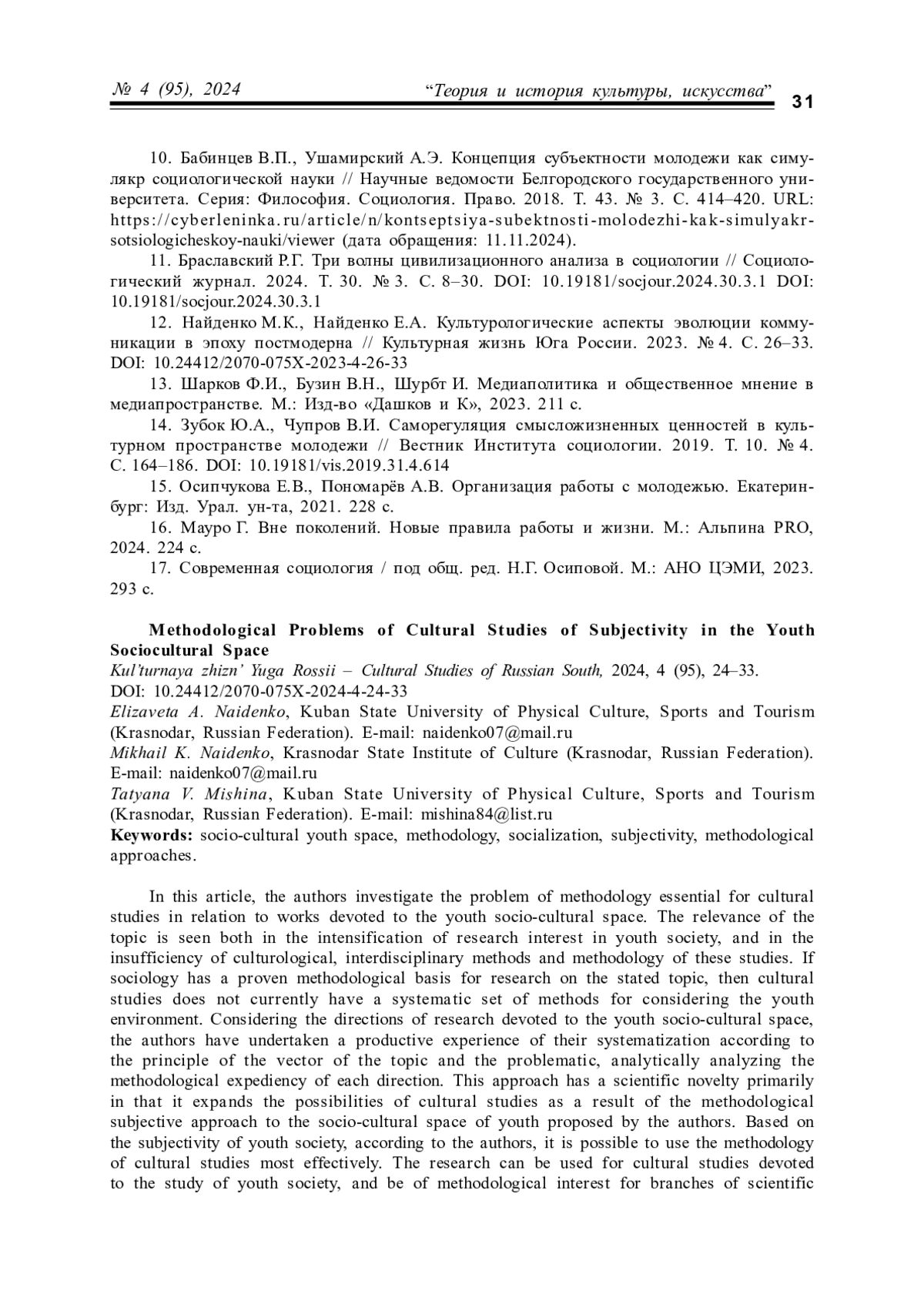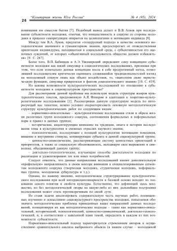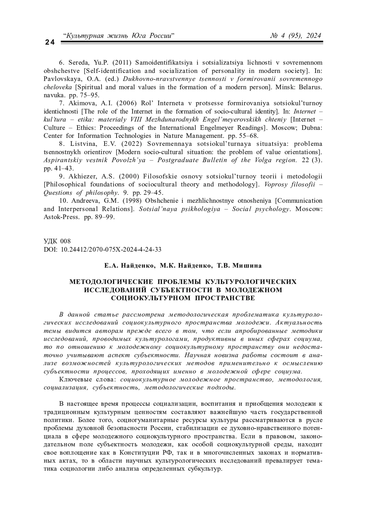 НАЙДЕНКО Е. А., НАЙДЕНКО М. К., МИШИНА Т. В. МЕТОДОЛОГИЧЕСКИЕ ПРОБЛЕМЫ КУЛЬТУРОЛОГИЧЕСКИХ ИССЛЕДОВАНИЙ СУБЪЕКТНОСТИ В МОЛОДЕЖНОМ СОЦИОКУЛЬТУРНОМ ПРОСТРАНСТВЕ // КУЛЬТУРНАЯ ЖИЗНЬ ЮГА РОССИИ. 2024. № 4 (95)