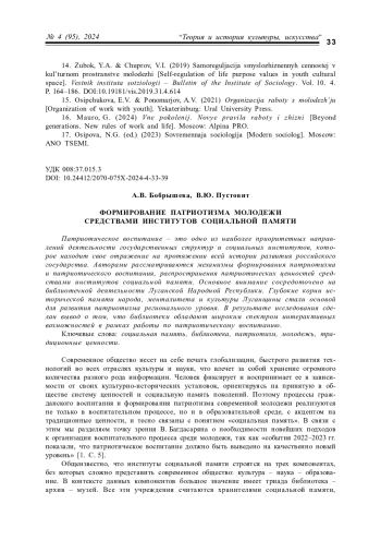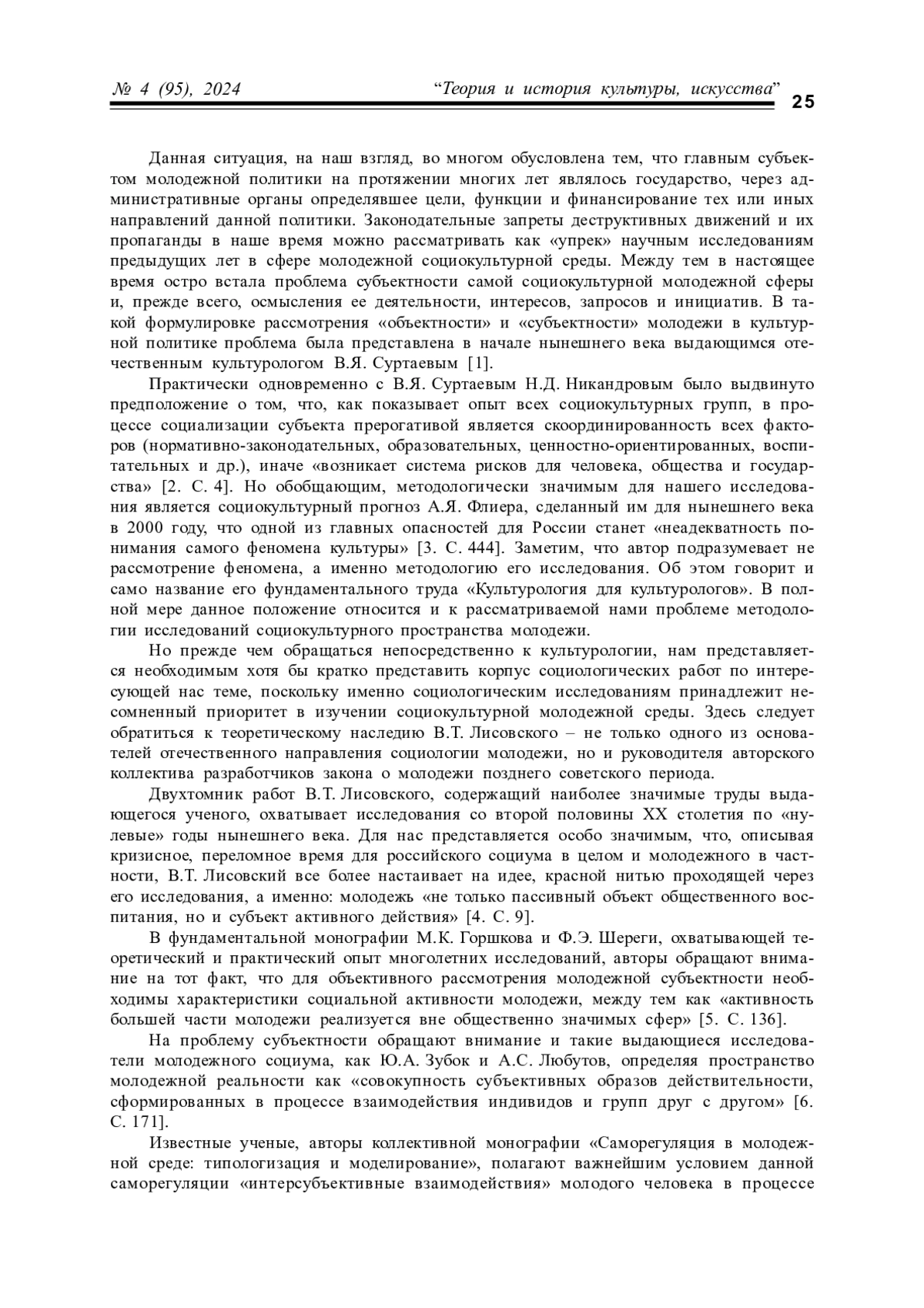 Статья: МЕТОДОЛОГИЧЕСКИЕ ПРОБЛЕМЫ КУЛЬТУРОЛОГИЧЕСКИХ ИССЛЕДОВАНИЙ СУБЪЕКТНОСТИ В МОЛОДЕЖНОМ СОЦИОКУЛЬТУРНОМ ПРОСТРАНСТВЕ (2024)