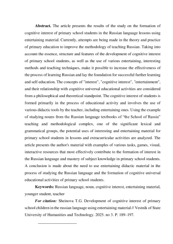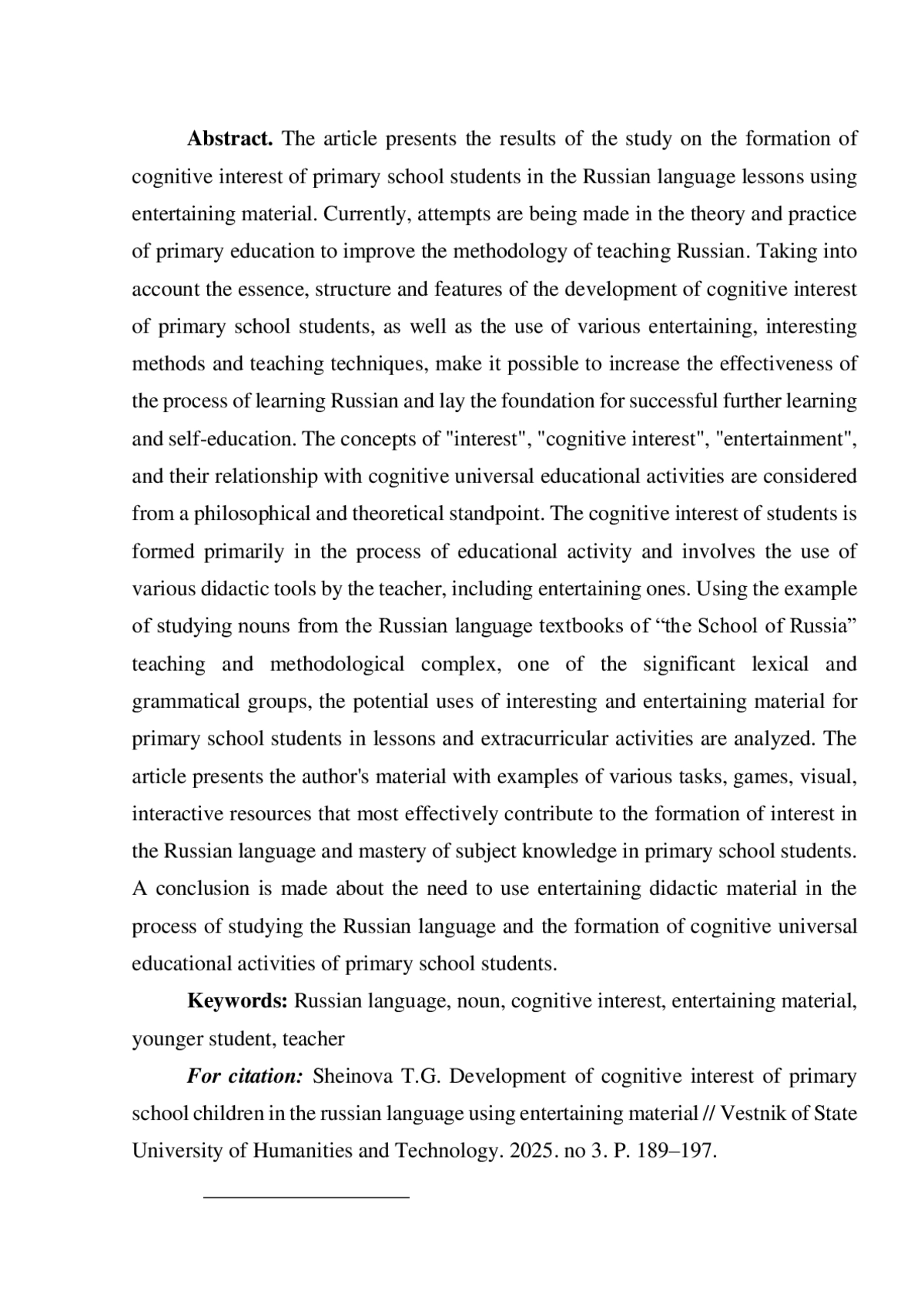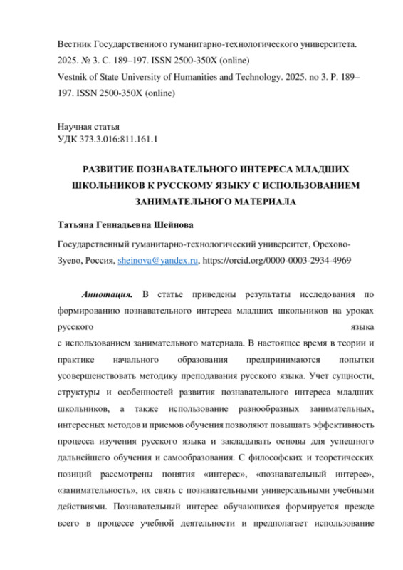 17. Шейнова Т.Г. Формирование предметных результатов младших школьников при изучении морфологии // Вестник государственного гуманитарно-технологического университета. 2025. №1. С. 134-140. EDN: MEYLYF