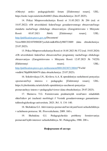 16. Соколовская И.Н., Кивилева А.А. К определению сущности понятия “познавательный интерес” в педагогике [Электронный ресурс]. URL: https://cyberleninka.ru/article/n/k-opredeleniyu-suschnosti-ponyatiya-poznavatelnyy-interes-v-pedagogike/viewer (дата обращения: 29.07.2025).