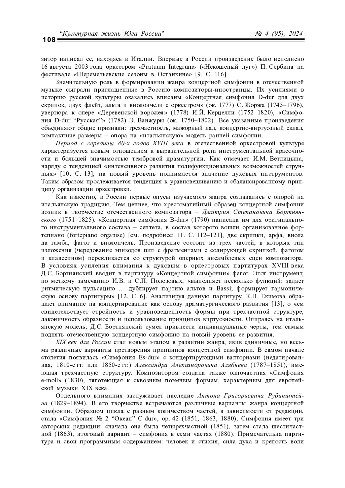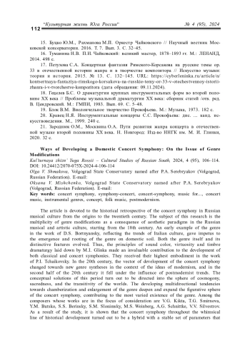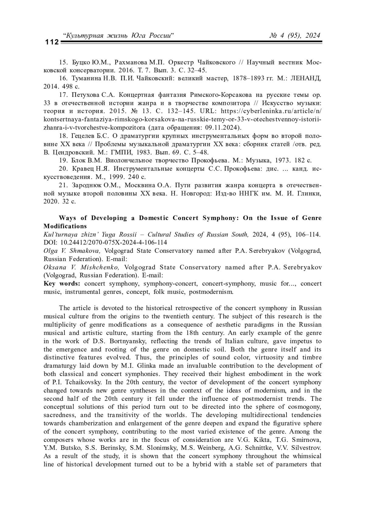 ШМАКОВА О. В., МИЩЕНКО О. В. ПУТИ РАЗВИТИЯ ОТЕЧЕСТВЕННОЙ КОНЦЕРТНОЙ СИМФОНИИ: К ВОПРОСУ МОДИФИКАЦИЙ ЖАНРА // КУЛЬТУРНАЯ ЖИЗНЬ ЮГА РОССИИ. 2024. № 4 (95)