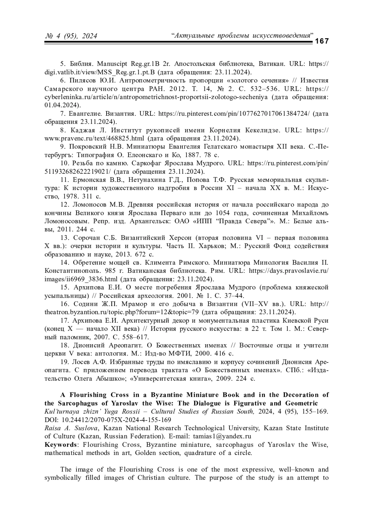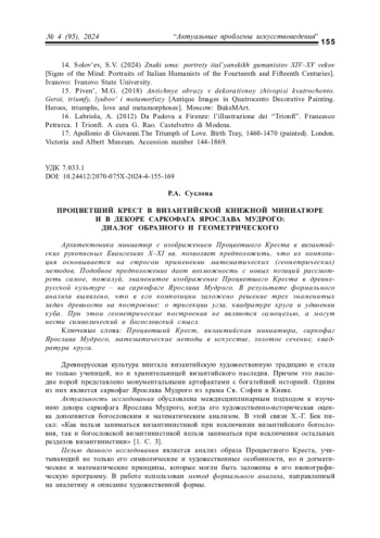 4. Татарникова А.О. Процветший Крест в раннехристианском искусстве. К вопросу о генезисе, символике и иконографии образа // Новое искусствознание. 2021. № 1. С. 6-16.